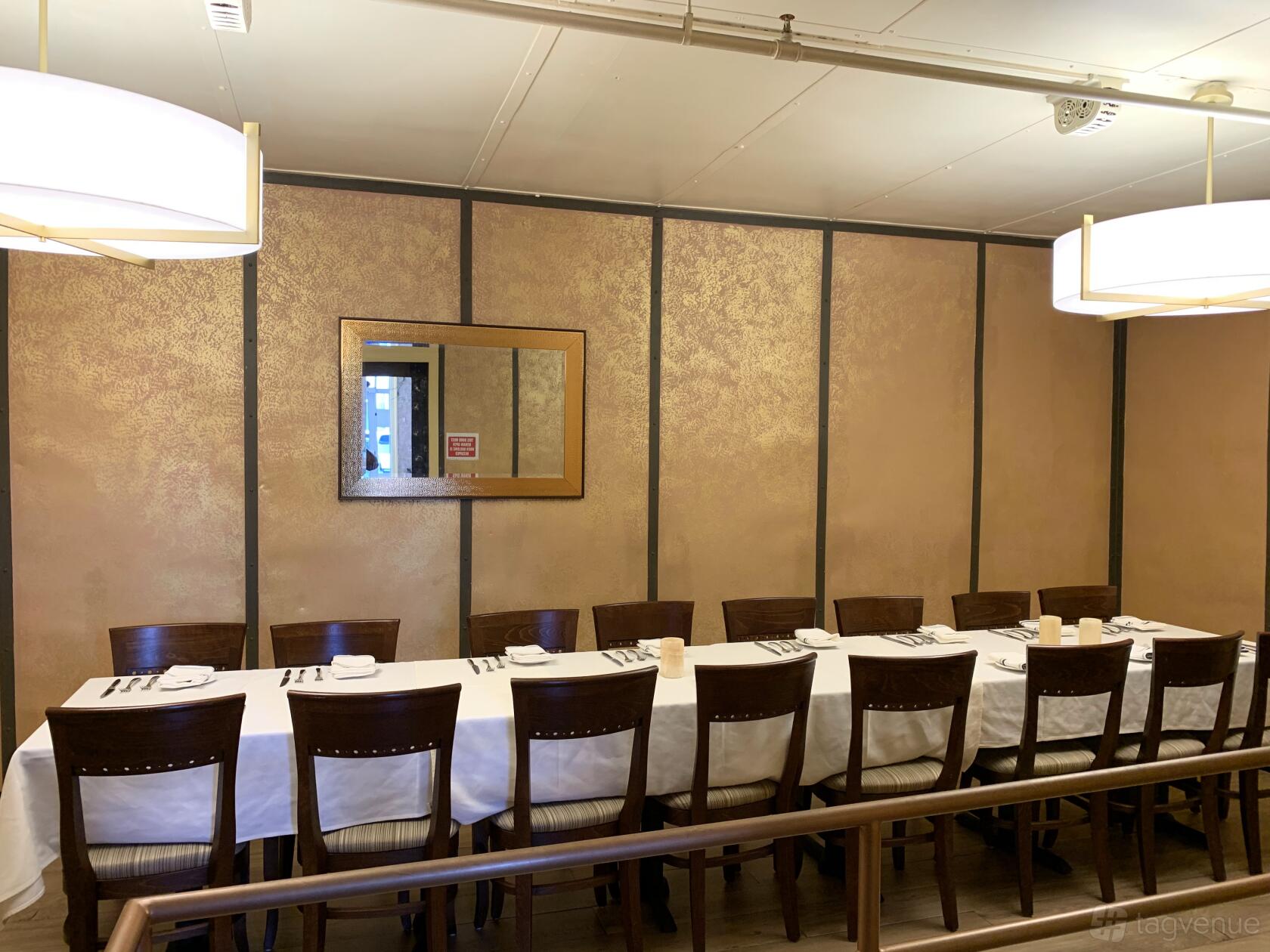 The space is great for small private events because it provides a sense of privacy and exclusivity. The decor is minimal yet classy, with framed artwork on the walls and soft lighting. It's a place where people can gather in a peaceful setting, enjoy a delicious meal, and focus on spending time together without distractions.