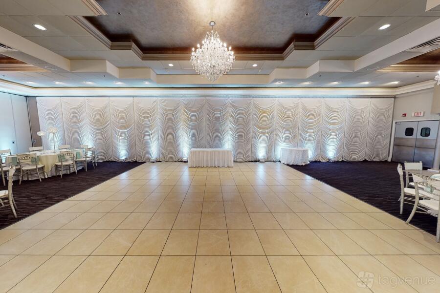 Inside, the room has soft drapes along the walls, adding a touch of charm without being overwhelming. The large dance floor is perfect for lively celebrations, with plenty of room for guests to mingle or enjoy entertainment. The flexible seating arrangements make it easy to customize the space to fit your event’s needs.