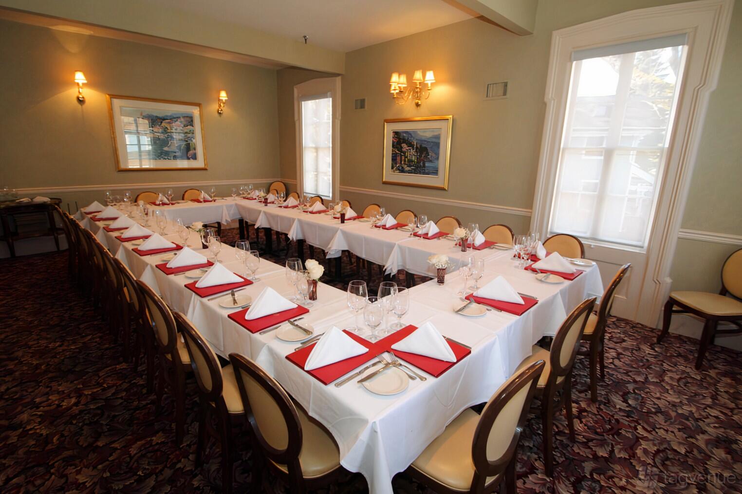 The Hamlet Room at Il Portico is a chic and spacious private dining area. It can hold up to 30 guests. Approximately 450 sqft, this room has soft green walls and vintage paintings. Large windows allow natural lighting in.