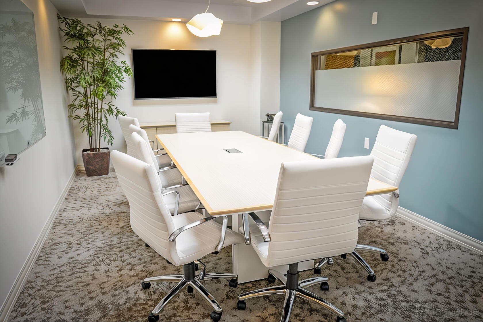 The room’s professional design promotes focus and collaboration. This space is ideal for larger team meetings, client presentations, or collaborative work sessions.