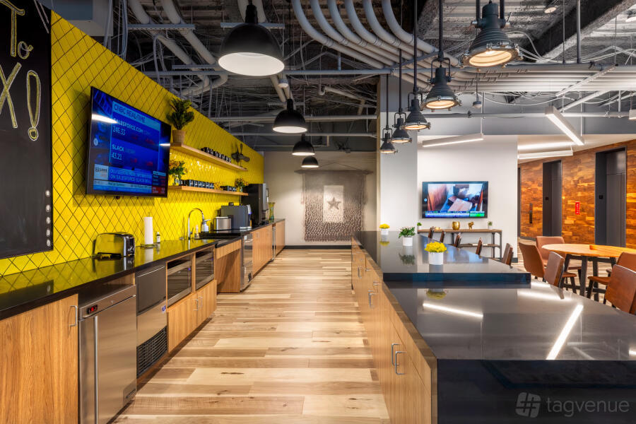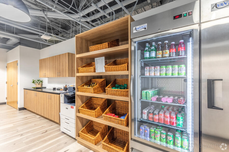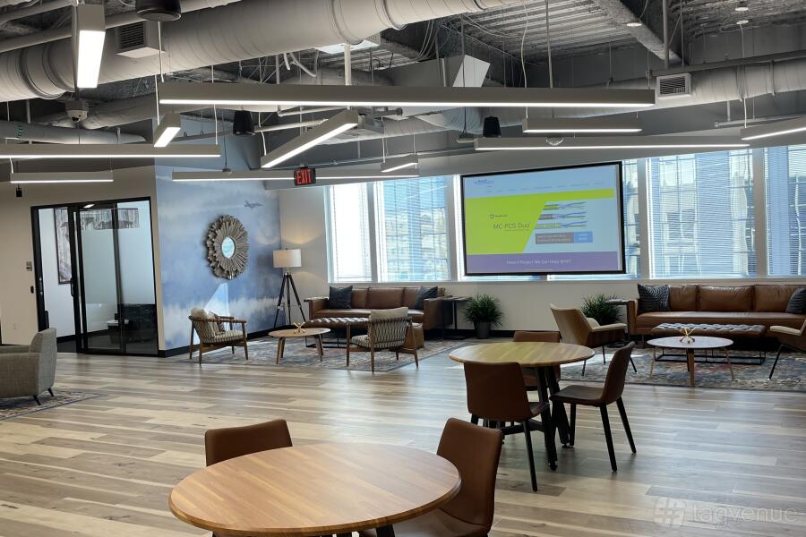 The modern designed space has high exposed ceilings with an industrial loft design, and floor-to-ceiling windows. There is a large lounge area that hosts events for up to 100 guests and a café. The offices offer privacy through frosted windows and was designed for more security conscious customers in mind (both the IT systems and the physical spaces). The offices are quiet, spacious with more square foot per person than any other flexible office space in the market. It is equipped with hi-tech meeting rooms, high speed fiber internet with dedicated LAN's available and more.