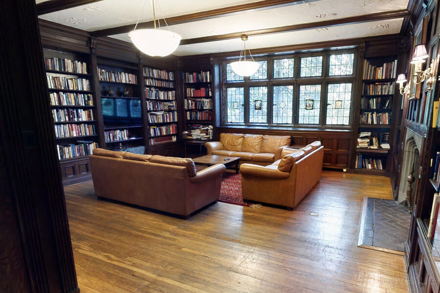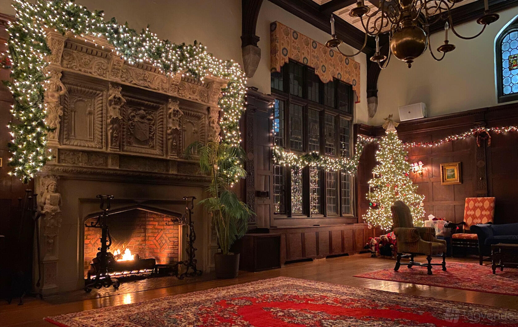 The Great Hall is a historic space designed for hosting formal events with a sense of grandeur. It features a 20-foot vaulted ceiling, which adds height and openness to the room. Large stained-glass windows bring in natural light, highlighting the antique furniture and a stone fireplace that creates a warm and inviting atmosphere.