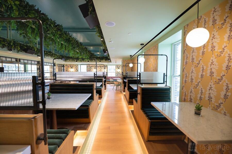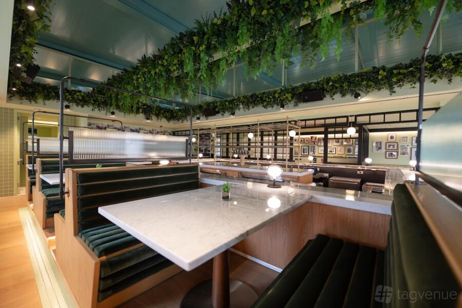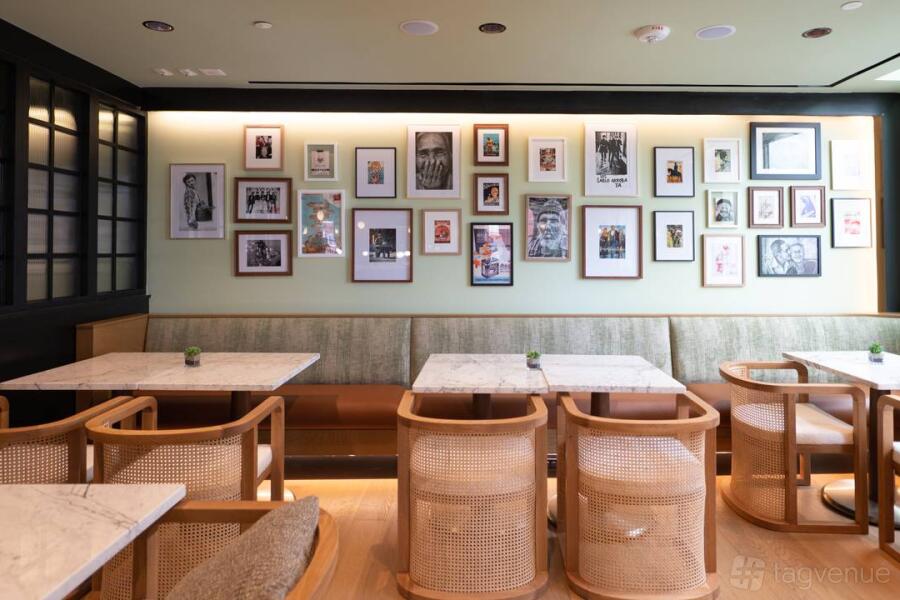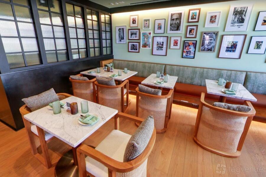 Looking for a versatile venue in Washington, DC? The Main Dining Area at Ambar Shaw, located on 7th Street NW near Rhode Island Avenue, offers a modern and well-lit space for various events. The space accommodates up to 80 people and features a contemporary interior with green walls, wooden furniture, and glass ceiling lamps. A bar area is also available.