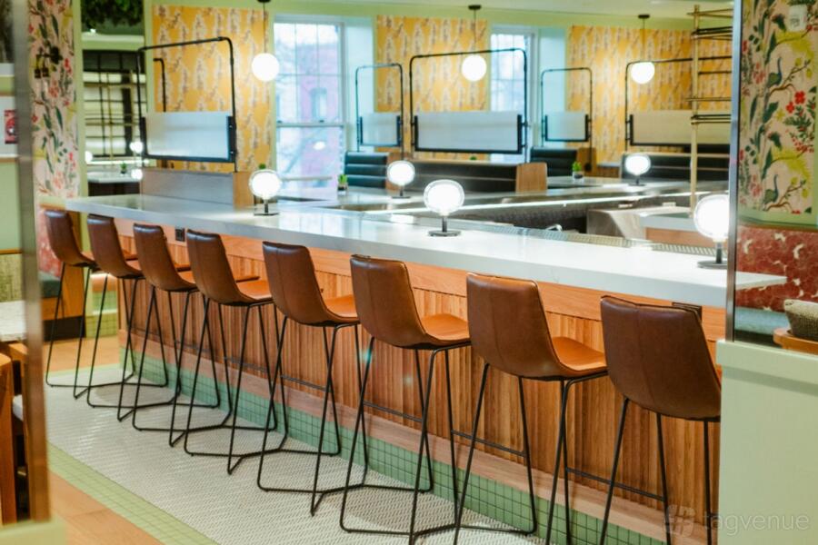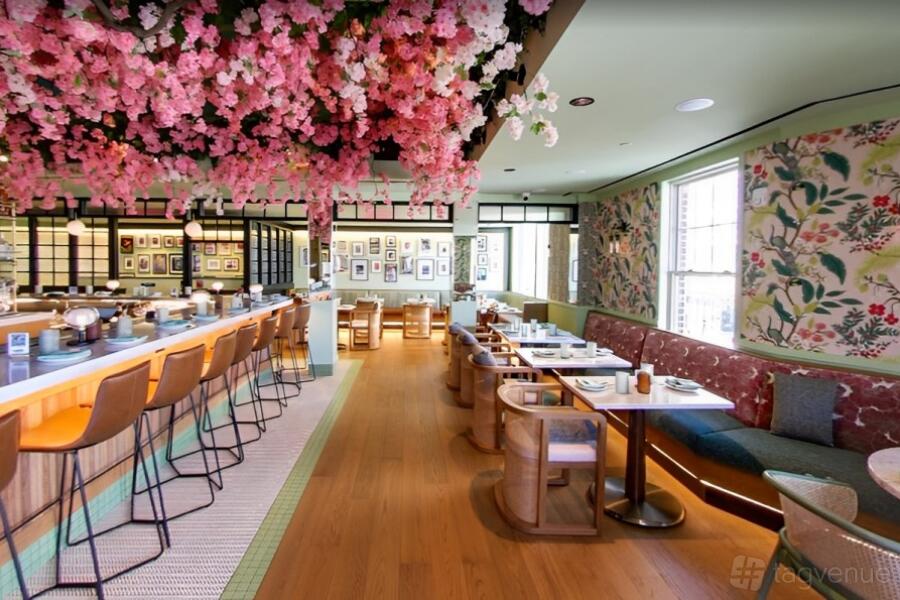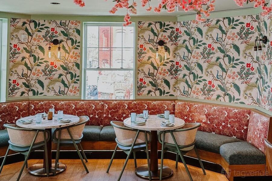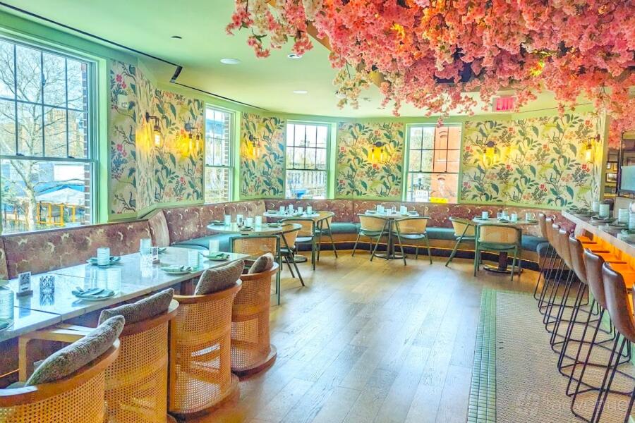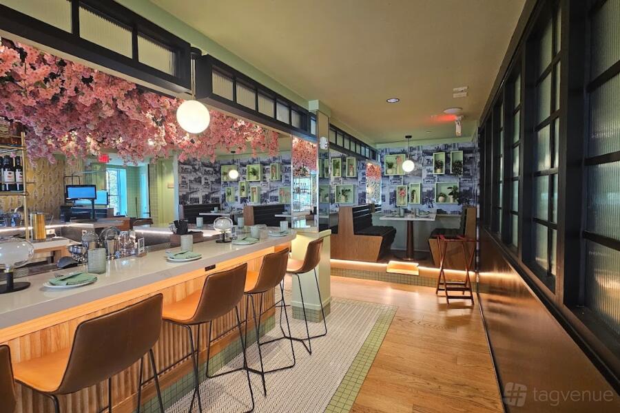 Ambar Shaw, located at 1547 7th Street NW in Washington, DC, is a modern restaurant offering Balkan cuisine with a contemporary twist. The venue features multiple spaces, including a dining area, patio, bar areas, and a rooftop. A distinctive floral ceiling adds a touch of elegance to the interior.