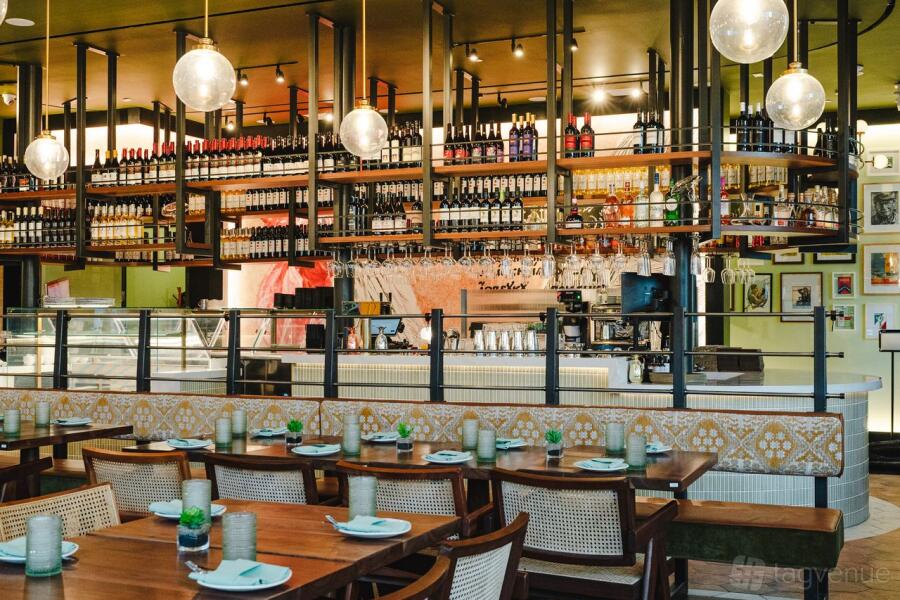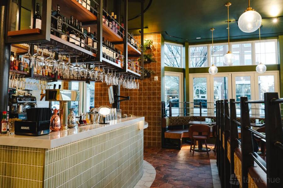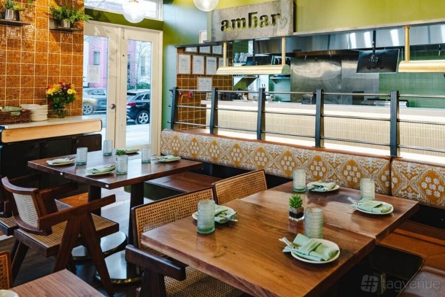Ambar Shaw, located at 1547 7th Street NW in Washington, DC, is a modern restaurant offering Balkan cuisine with a contemporary twist. The venue features multiple spaces, including a dining area, patio, bar areas, and a rooftop. A distinctive floral ceiling adds a touch of elegance to the interior.
