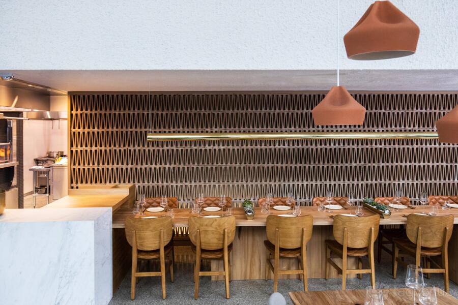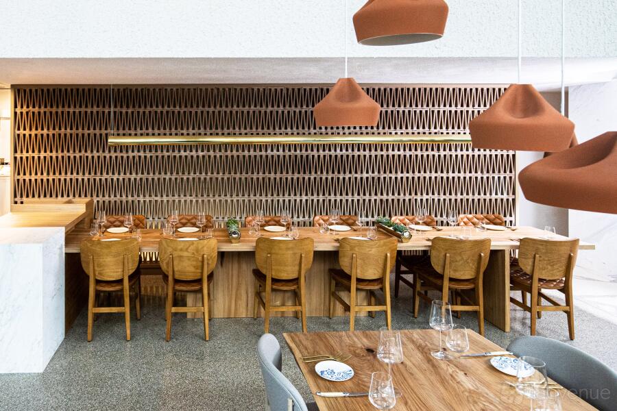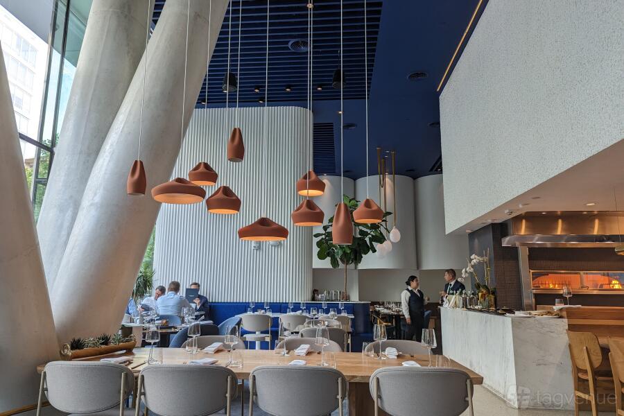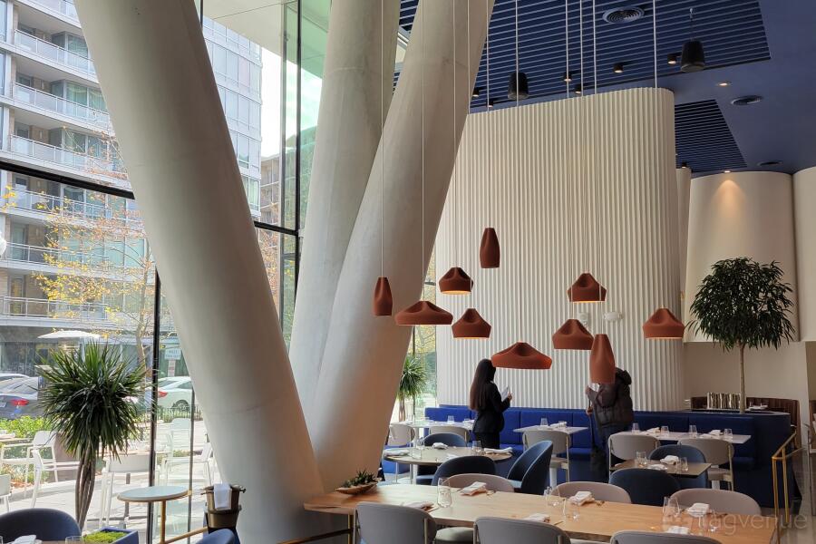 Imperfecto offers a welcoming 2,000 sqft dining space that beautifully mixes Greek and Mediterranean style with a touch of Latin American flair. With sleek communal tables, cozy private seating areas, warm wooden accents, modern pendant lights, and intricate design details, the space feels both stylish and inviting. Large windows and lush indoor greenery add to the open atmosphere, perfectly complementing the sophisticated yet relaxed vibe.