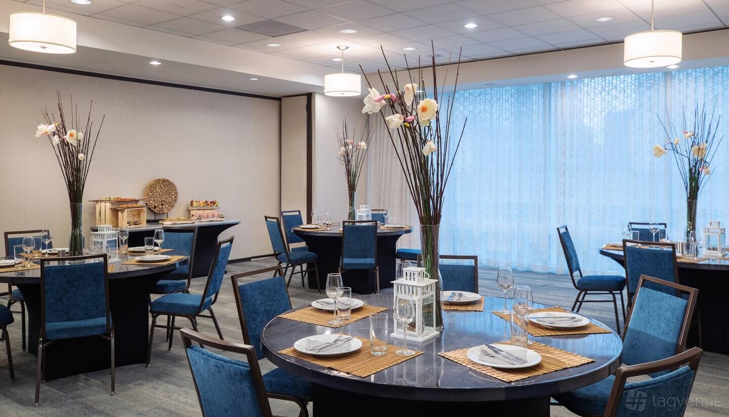 The venue features four distinct rooms, each space equipped with state-of-the-art AV technology, ergonomic seating, and ample natural light, making them ideal for meetings, training sessions, banquets, or intimate gatherings. Guests also benefit from amenities like high-speed WiFi, a business center, and breakout lounge areas with plush seating and stylish decor. For casual dining or refreshments, the on-site bar and bistro provide convenient options, while the chic lobby offers a welcoming space for networking or relaxation.