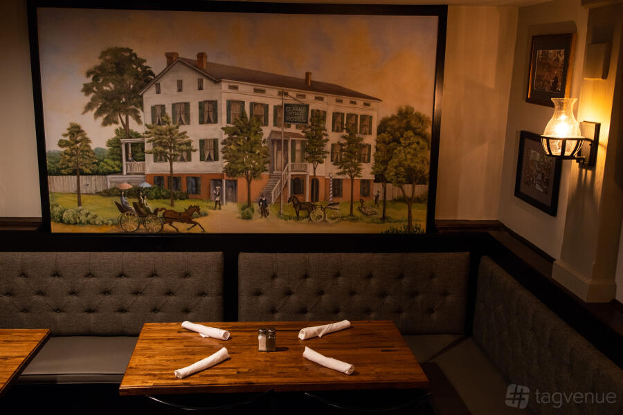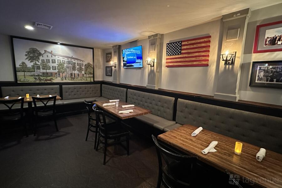 Near to the bar, the grey dining room beckons diners. Tables are set for service, each one ready to host guests. The walls of this room feature framed horse paintings, capturing the spirit of the American frontier. And there, proudly displayed, is the iconic American flag—a symbol of unity and heritage. 1940 Tavern seamlessly blends American nostalgia with modern comfort, making it a delightful spot for both drinks and dining.