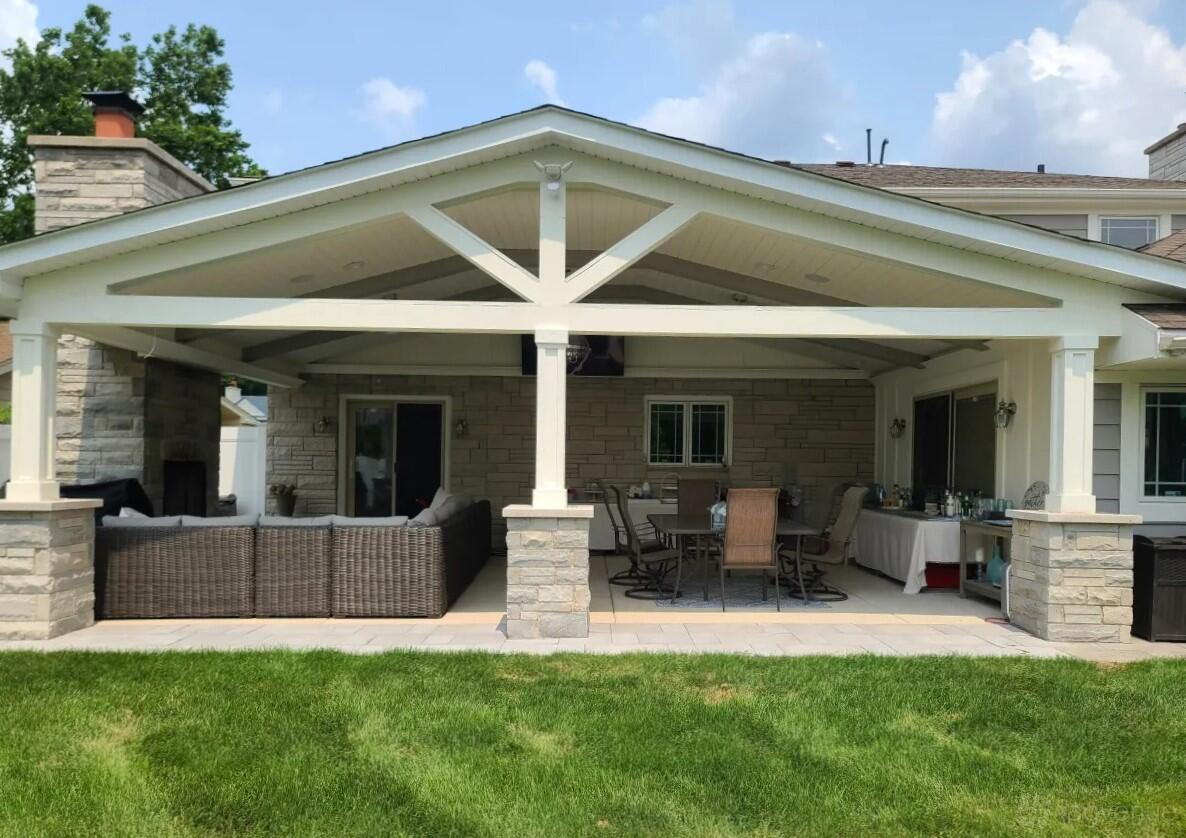 The outdoor spaces, including a covered patio with a wood-burning limestone fireplace and a scenic backyard, provide excellent settings for outdoor scenes or intimate gatherings. The finished basement, featuring a full wet bar, adds extra space and flexibility for events or filming.
