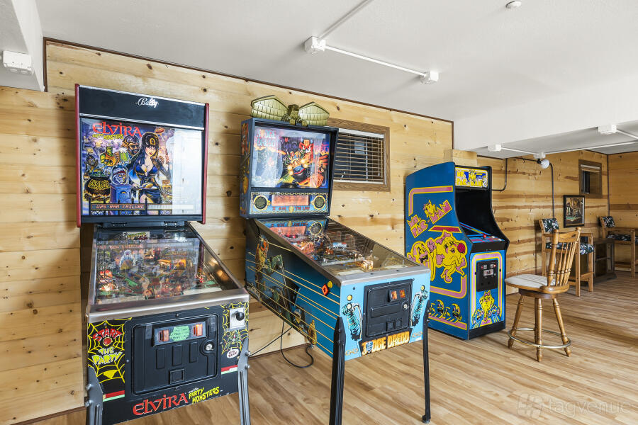Entertainment options at Wrightwood Castle are wide-ranging. Guests can relax in the high-tech spa/hot tub, enjoy the retro arcade room with vintage games, or stay active in the on-site gym. The library and bar area provide additional spaces for relaxation and socializing, making it easy to cater to diverse interests and preferences.