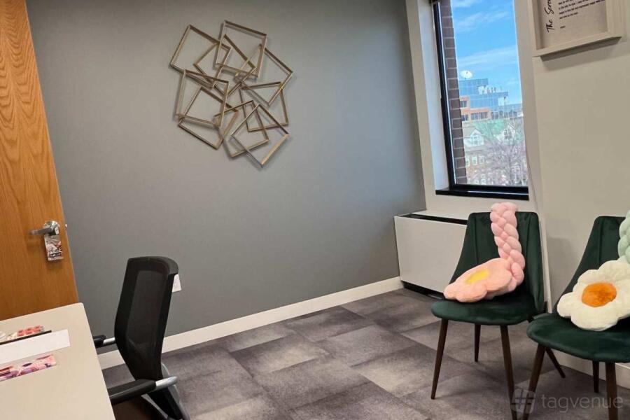 The space features a kitchenette with a large fridge, sink, and microwave, and is equipped with WiFi, tables, chairs and a whiteboard. It is conveniently located near public transportation. Please note that amplified music is not permitted.