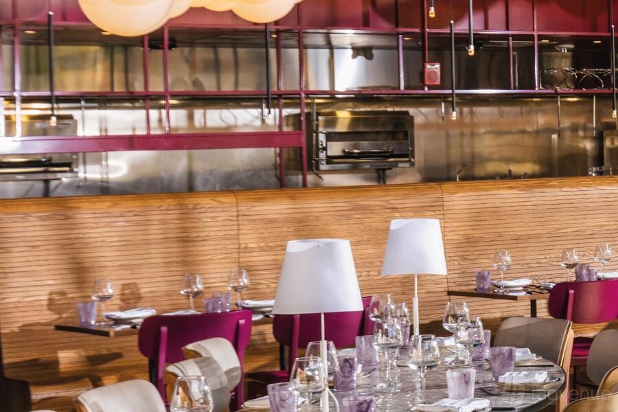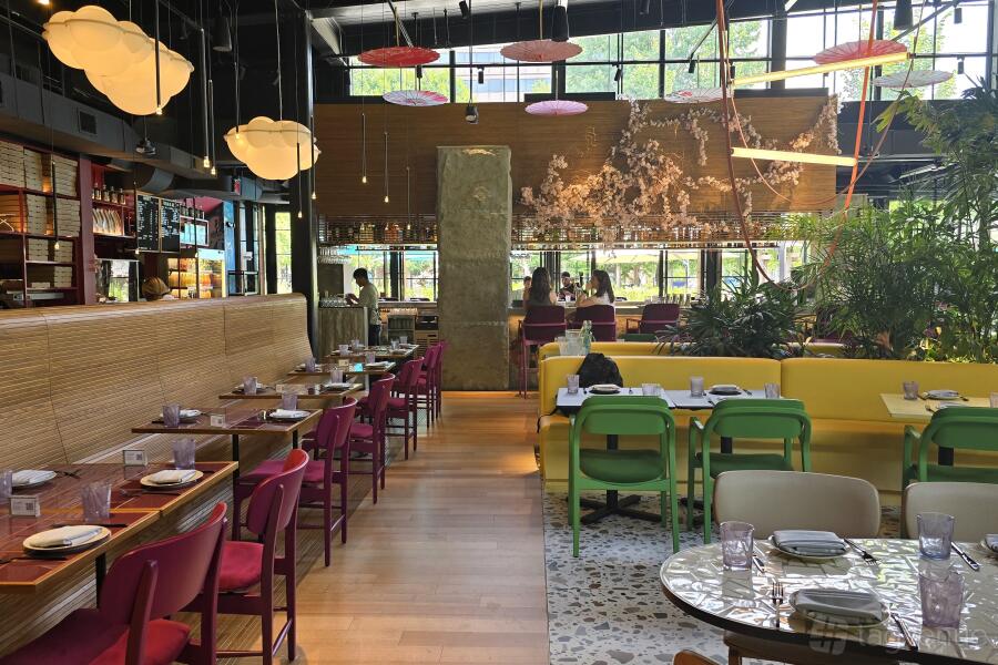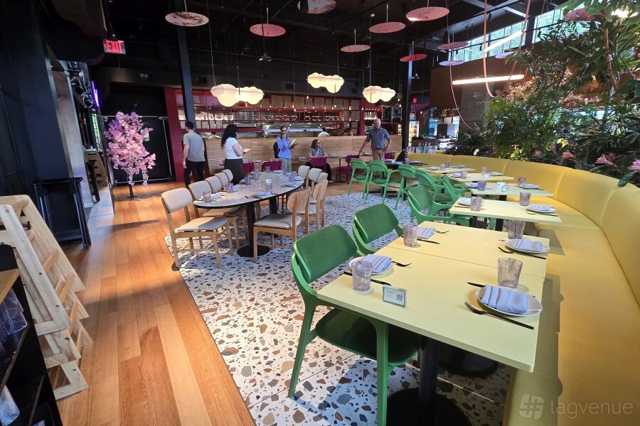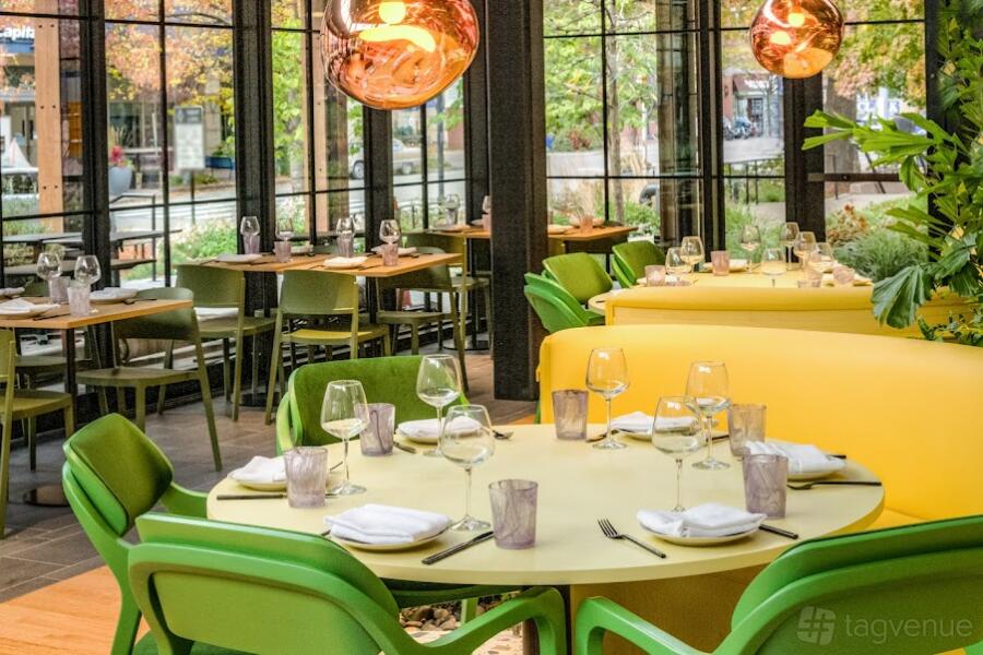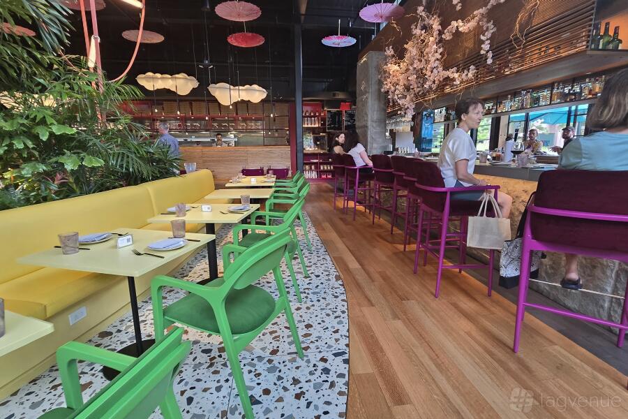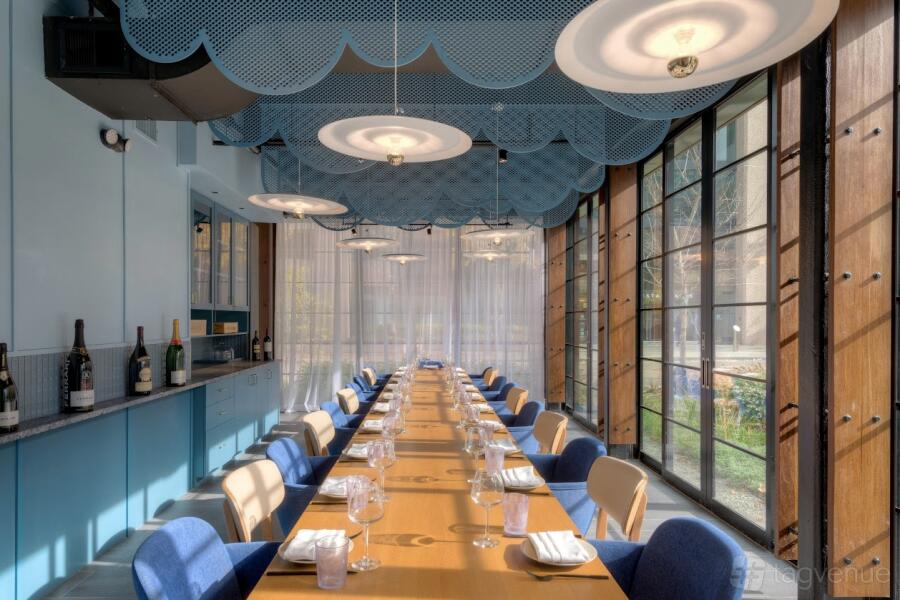 Our spacious main dining room features colorful seating, a central bar, and lush greenery, all bathed in natural light from large windows. For those seeking a more intimate spot, our private dining room offers an unforgettable setting, with striking blue, cloud-like ceiling accents and custom lighting that adds a touch of magic.