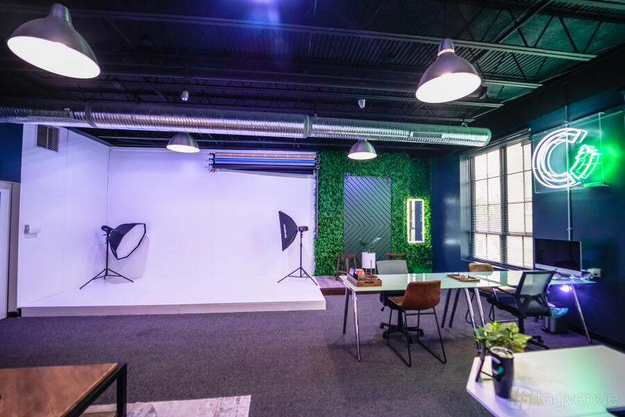 The creative space includes a beautiful theme of green, black and white throughout. Includes a nature inspired "Garden of Eden" themed wall and white walled stage. We serve as the perfect location for brands, entrepreneurs and corporations.