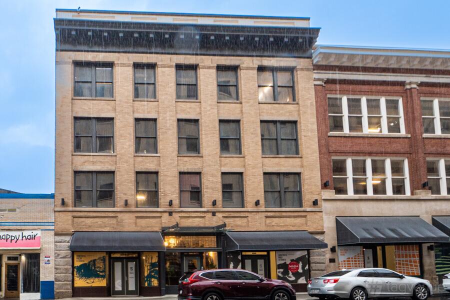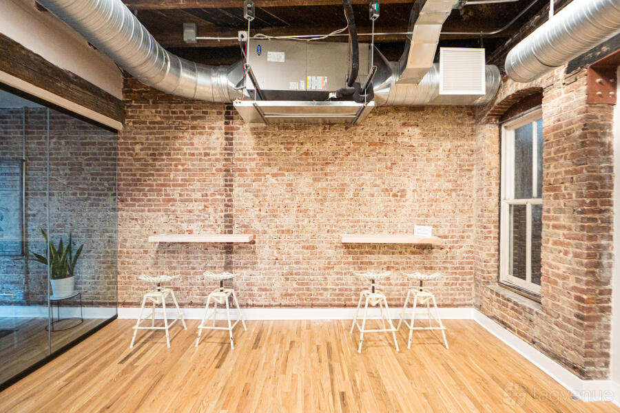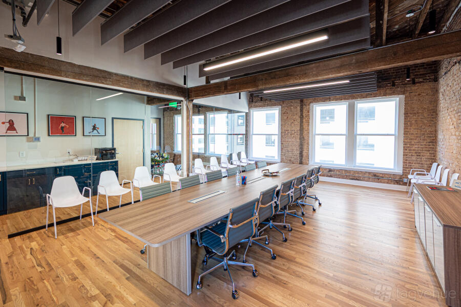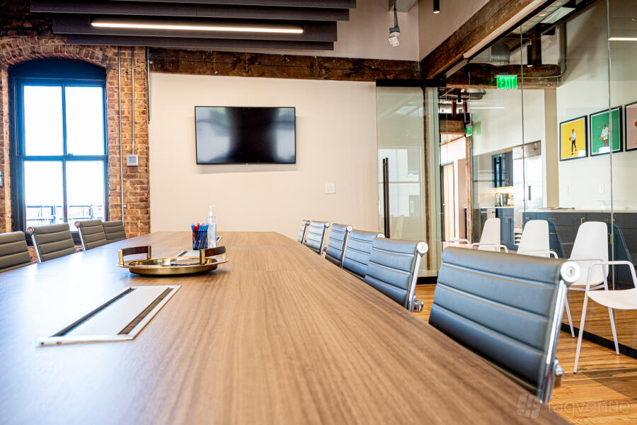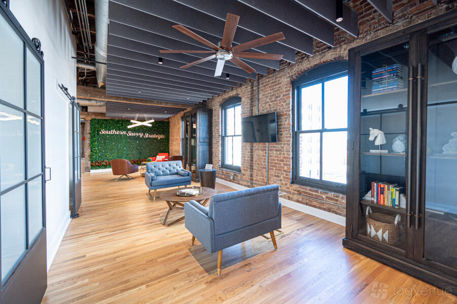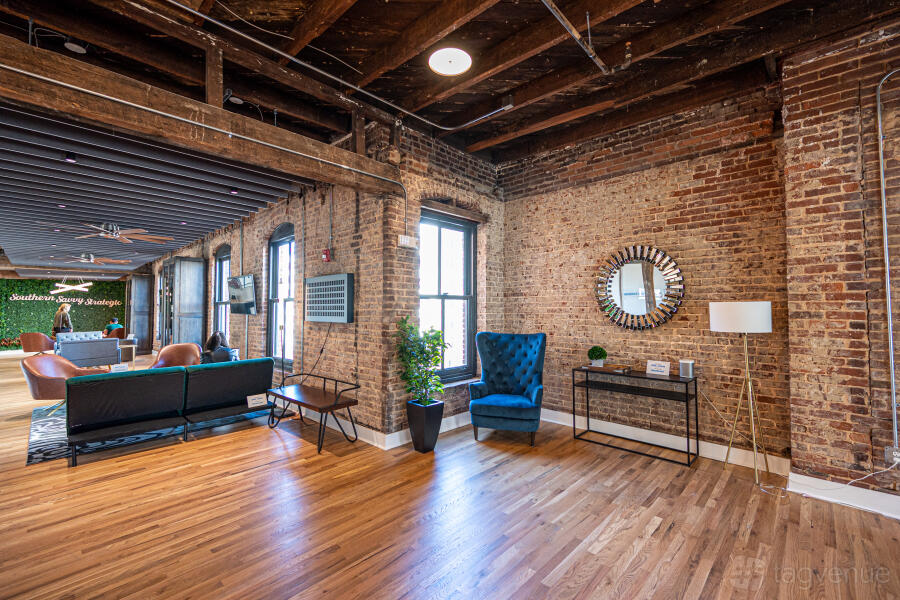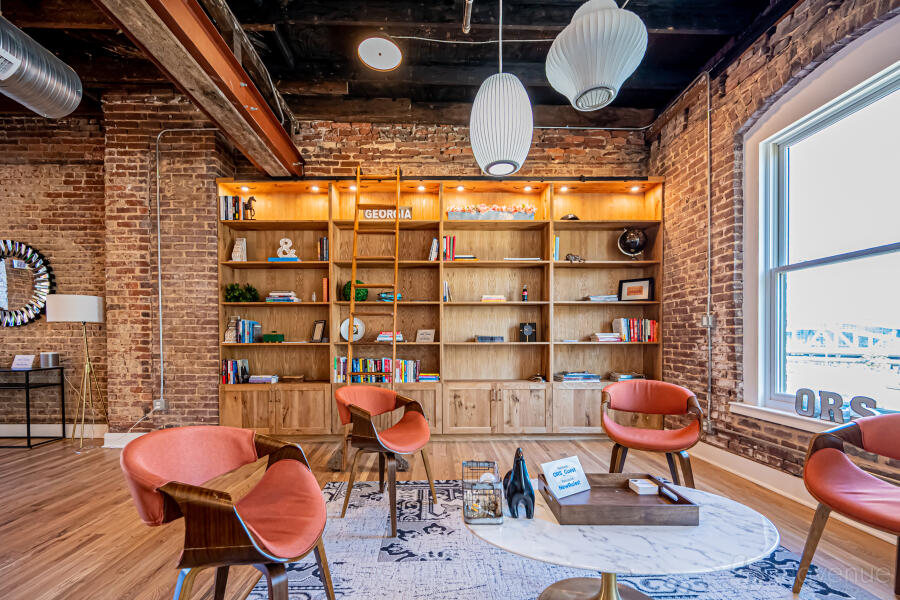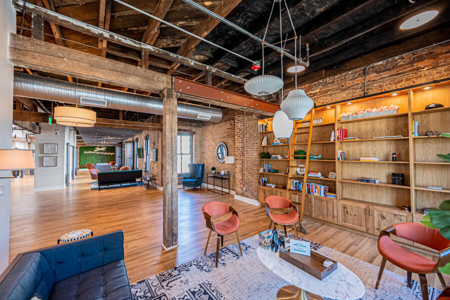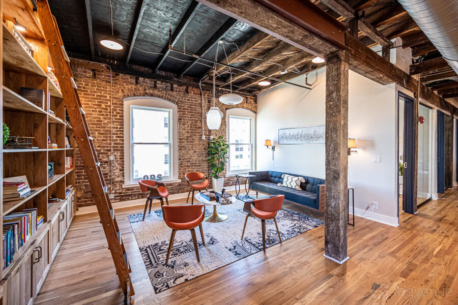 Our open and flexible floor plan features abundant natural light, exposed brick and original beams throughout, with views of the downtown skyline and nearby attractions. Inside is a sunset lounge, custom built library, oversized boardroom, collaborative, coworking and office space furnished in contemporary style.