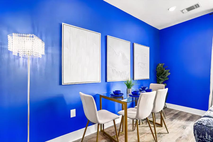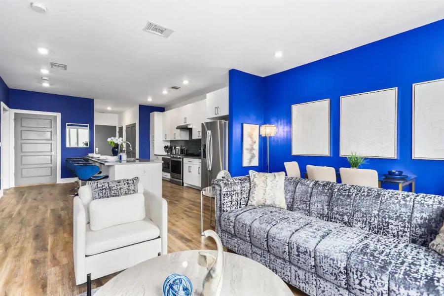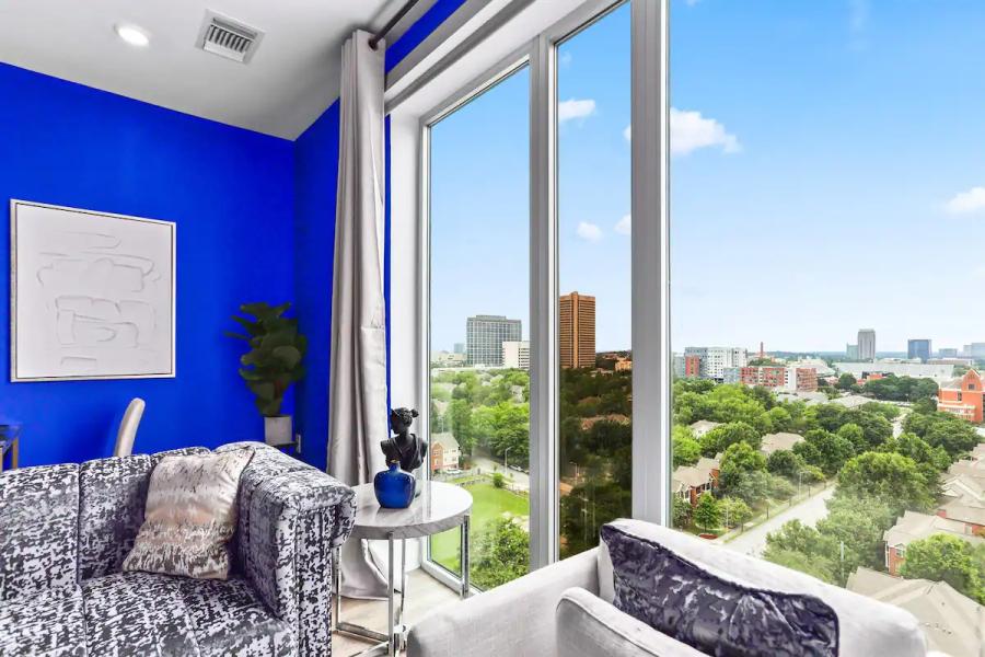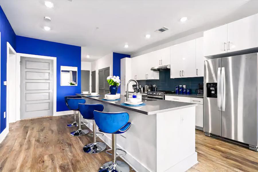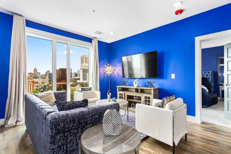 Unlock Stays architects have masterfully crafted this space to reflect the atmospheric vibes of a clear, starlit desert sky and the tranquil depths of the ocean. The apartment's architecture boasts open, flowing spaces that transition seamlessly from one area to another, complemented by high ceilings and large windows that invite the city's energy while ensuring a serene, sound-managed environment. Elegant decor bathed in rich, midnight tones creates an ambiance of understated opulence, perfectly balancing the vibrancy of Downtown Atlanta with a peaceful, private setting.