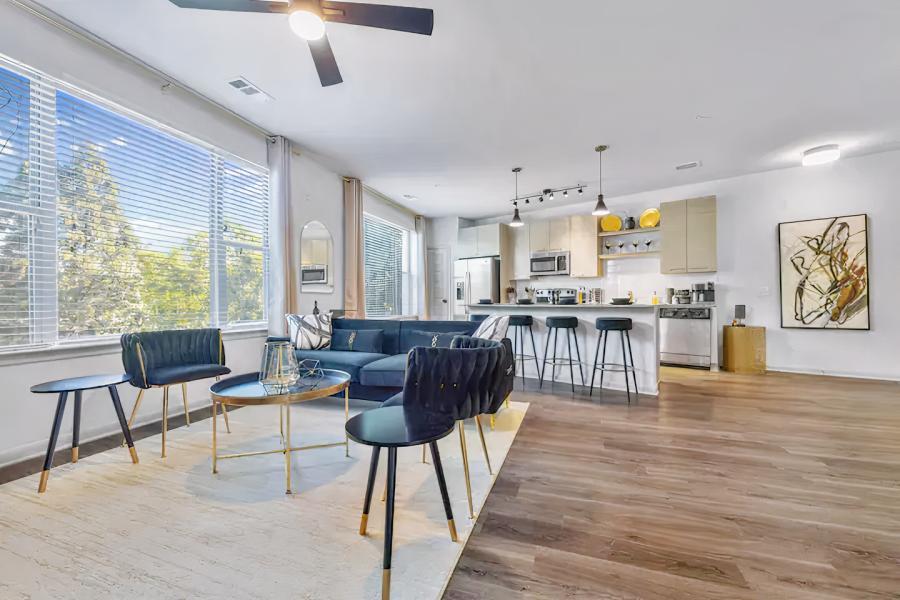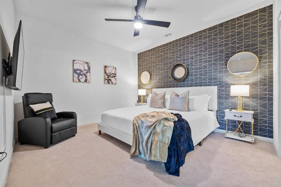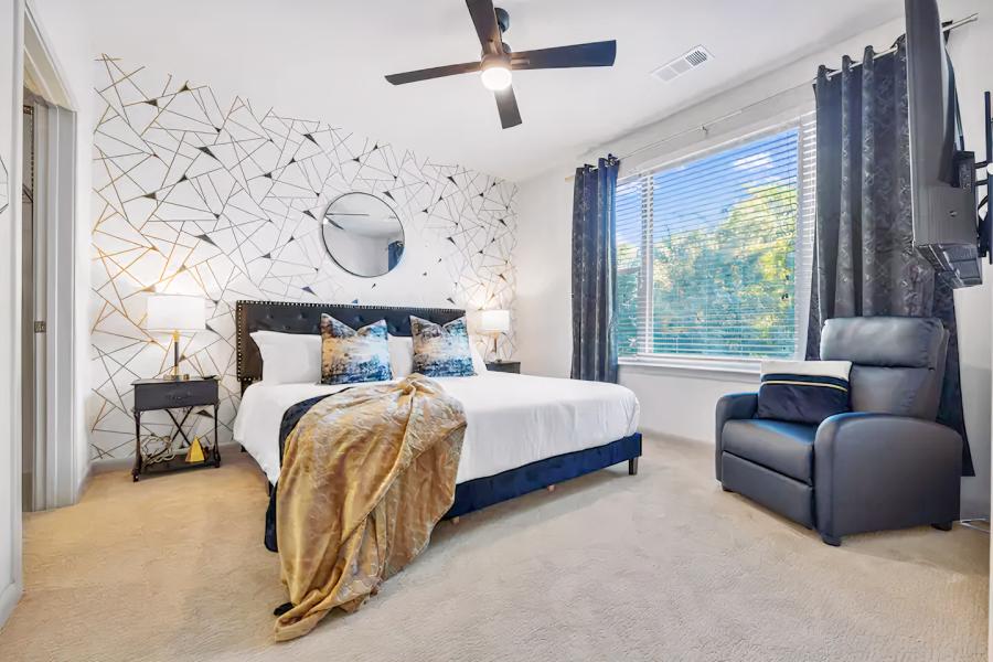 Unlock Stays' masterful design transports you into an interior draped in opulence, where gold and black hues intertwine to set a tone of unmatched elegance. Accommodating four guests with ease, each bedroom is a sanctuary featuring king-size beds, soothing massage chairs, and en-suite bathrooms, exuding a royal ambiance fit for any professional, romantic couple, or close-knit group seeking both Decatur's dynamic pulse and the solace of a deluxe retreat.