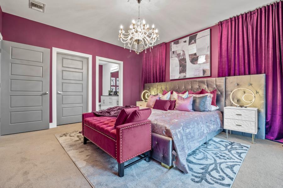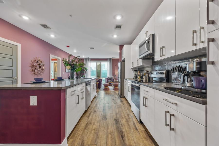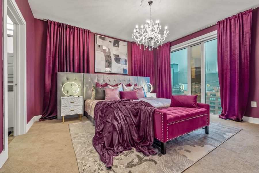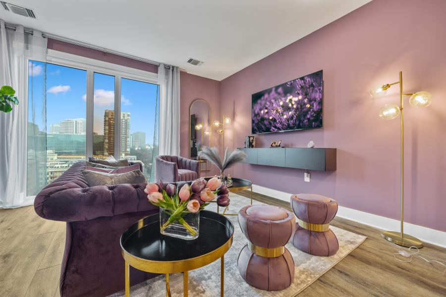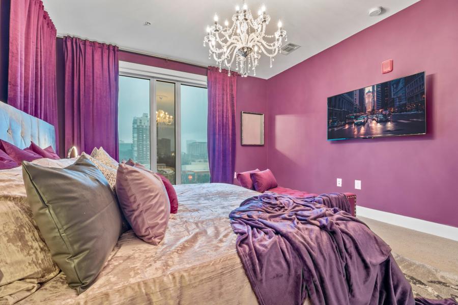 Envelop yourself in the splendor of The Velvet Room, where every inch is drenched in majestic purples offset by tasteful gold and silver hues, creating a setting that whispers luxury. This apartment is thoughtfully equipped to sleep four guests in absolute comfort, with plush king and queen beds set against a backdrop of serene elegance. The gourmet kitchen invites culinary adventures, while the entire space has been curated for acoustic privacy, ensuring a tranquil ambiance amidst the city's vibrant hum.