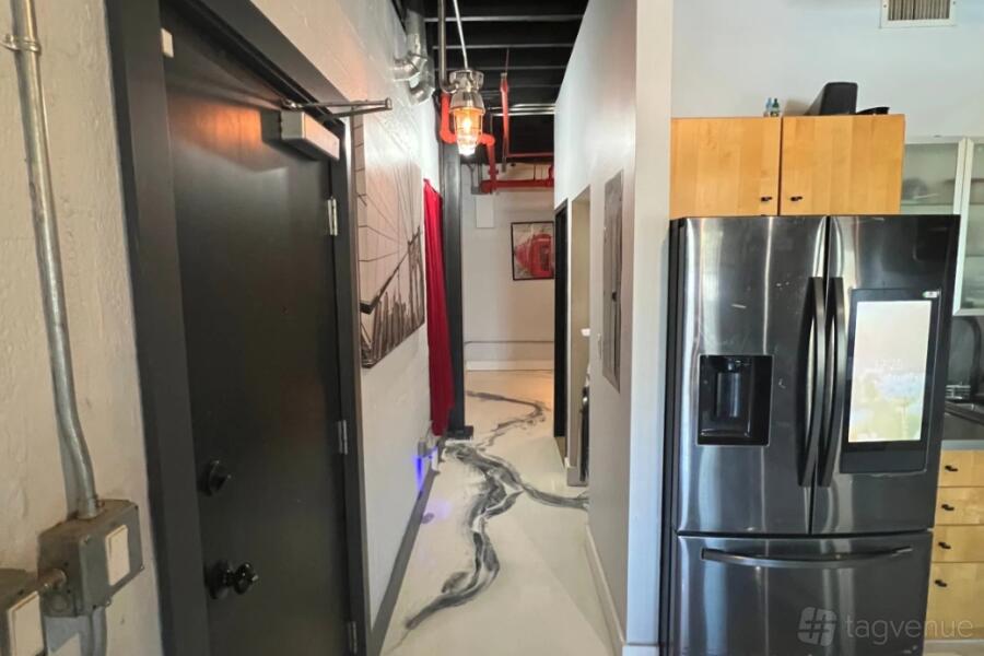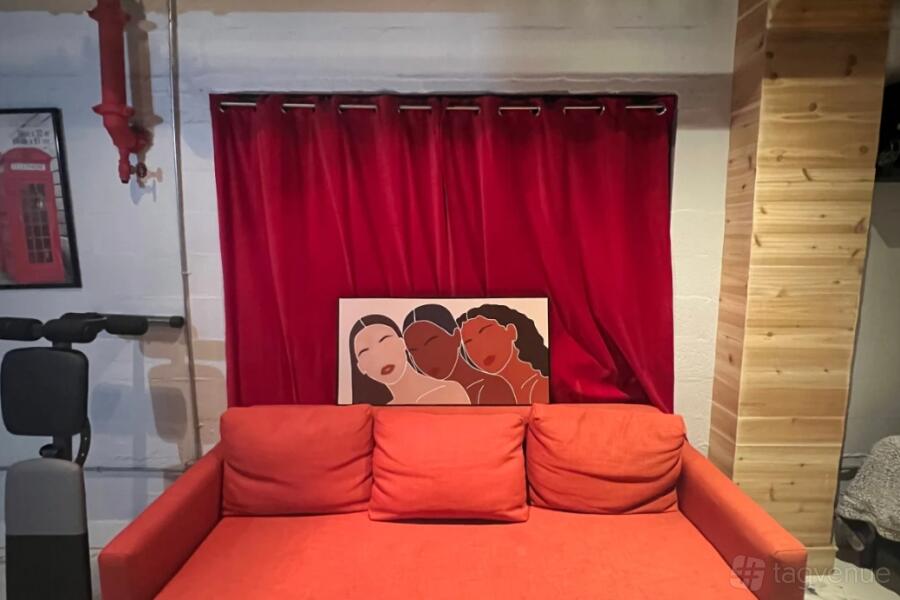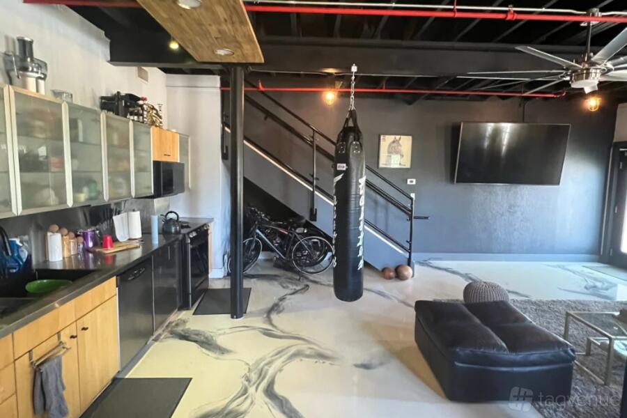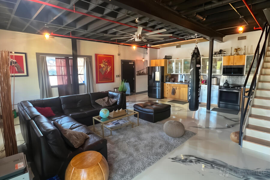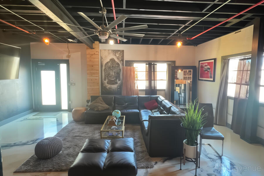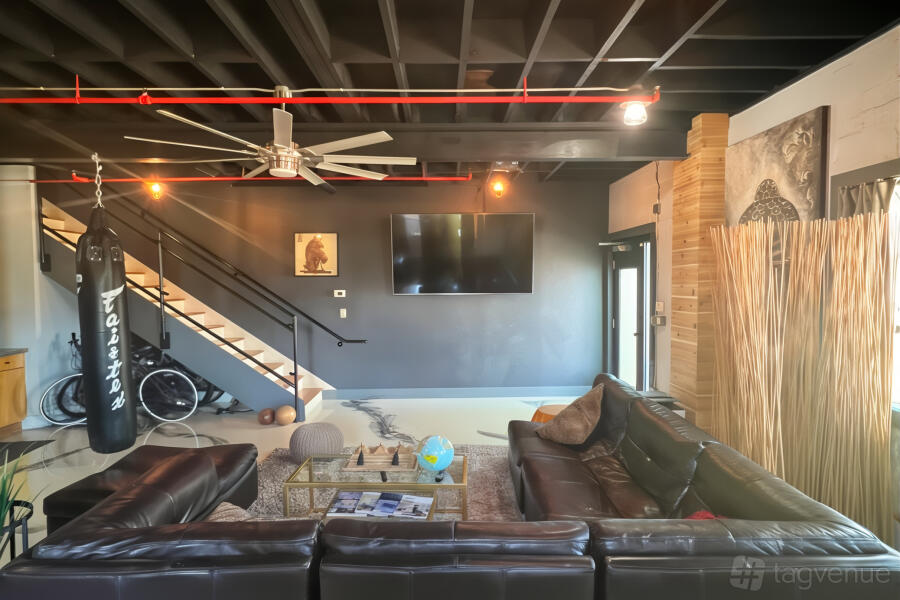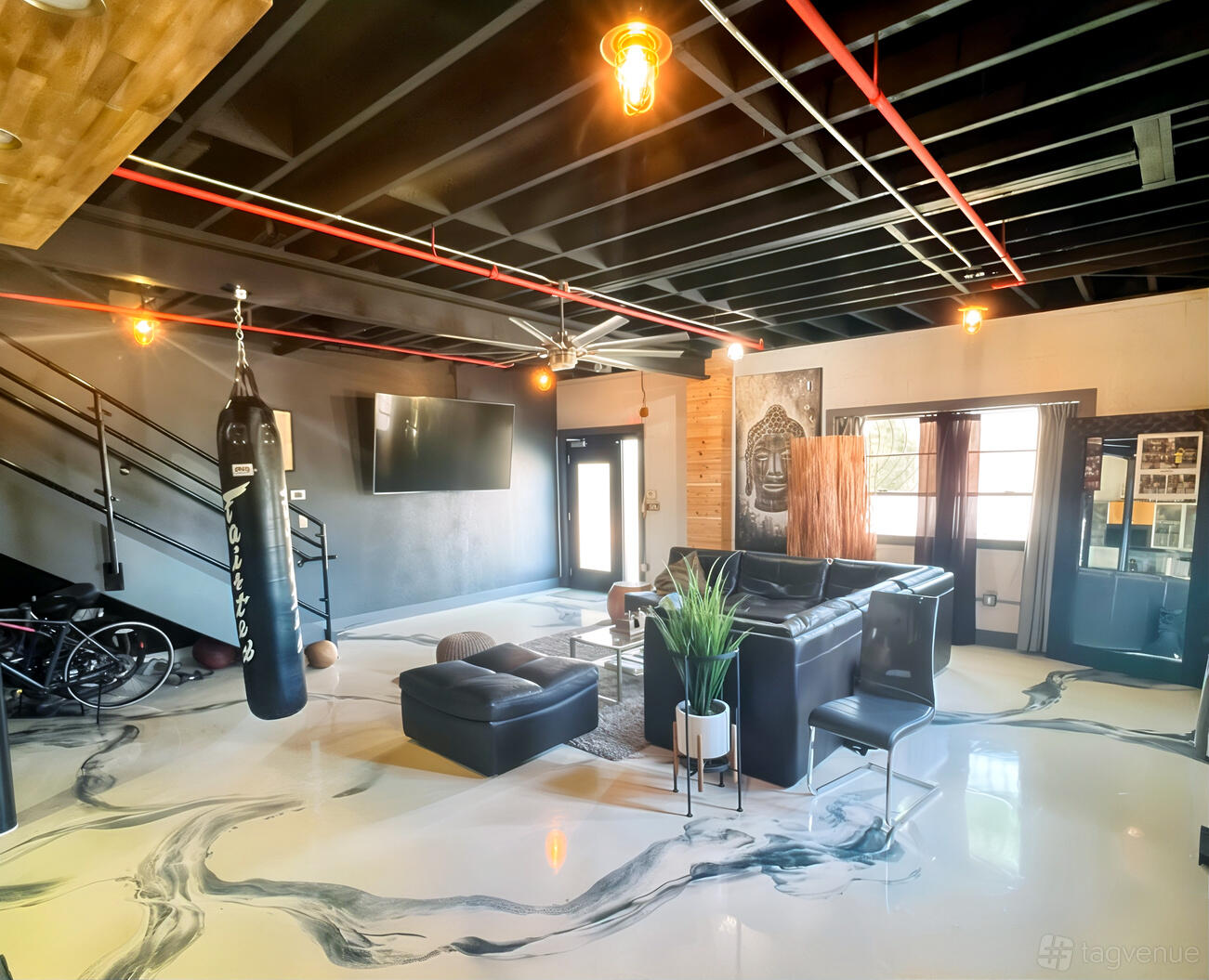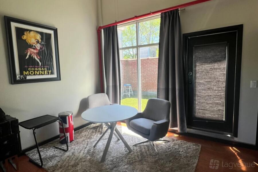 The venue features comfortable furnishings, a full kitchen, a large TV, and outdoor seating on the second-floor patio, making it an ideal choice for creative projects or small events.