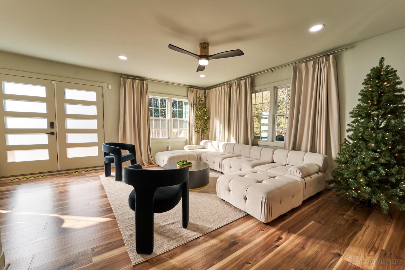 Inside, the studio features an industrial-style blackout room for controlled lighting and a backdrop room for headshots and portraits. The furniture can be moved to fit your needs, making it adaptable for pop-up events, small gatherings, business meetings, or content creation.