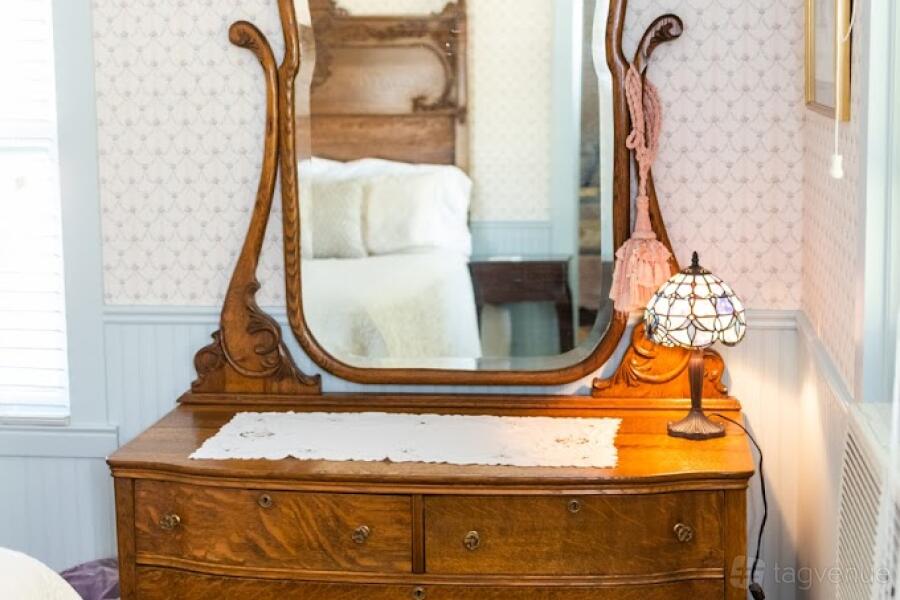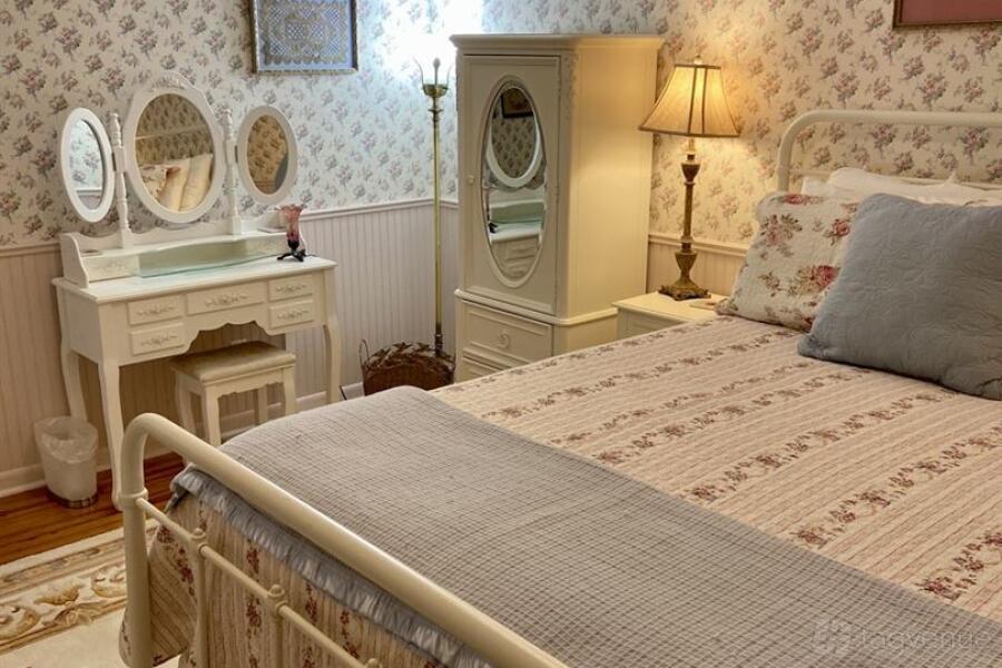 The Rock Farmhouse features a porch the length of the house - complete with a porch swing. Nearby barns are nestled beneath an overhanging, huge old oak.