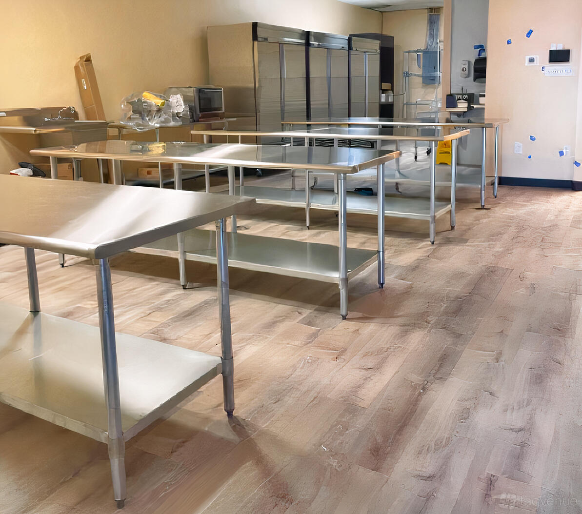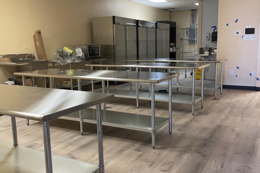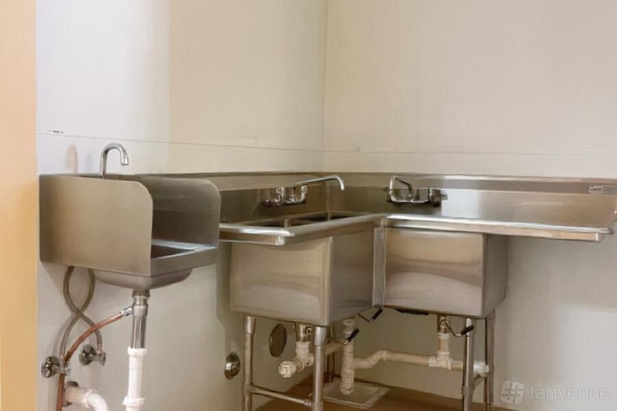 The venue includes two bathrooms for convenience, spacious work tables for collaborative efforts, and three-compartment sinks along with a dedicated produce sink for efficient food prep. You'll also find cold and dry storage to keep ingredients fresh, high-quality ovens, a food processor for versatile cooking, and a panini press for gourmet sandwiches.