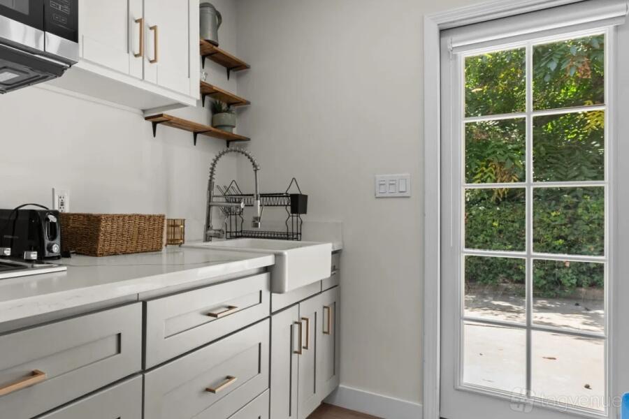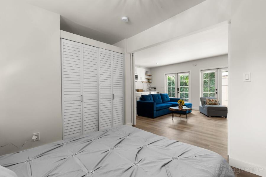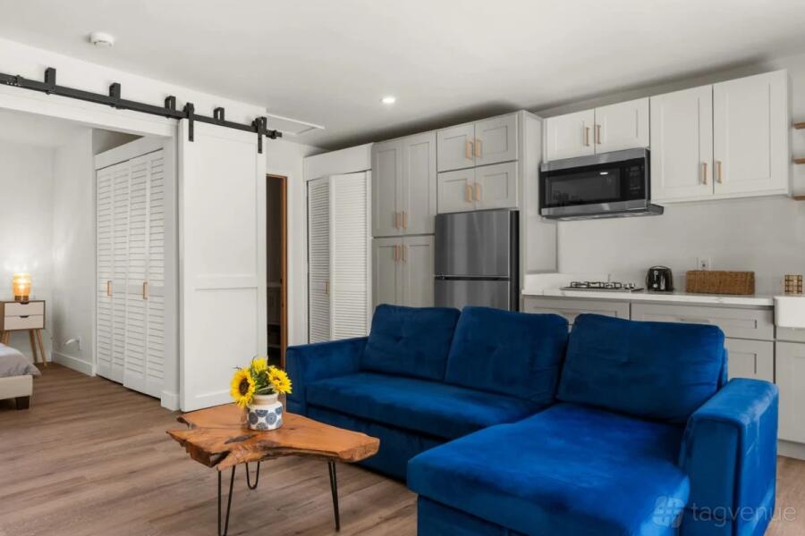 The guest house features a well-equipped kitchen with a cooktop, microwave, and full-sized refrigerator, ideal for preparing light meals. The living space includes a work desk, making it a versatile choice for creative projects or quiet retreats. The separate bedroom boasts a queen-sized bed, closet, and stylish barn doors for added charm.