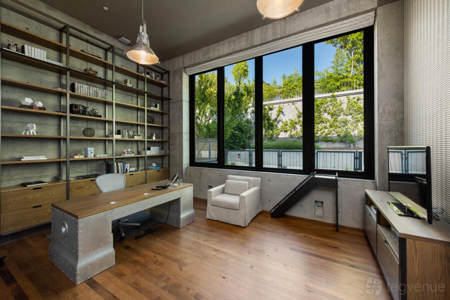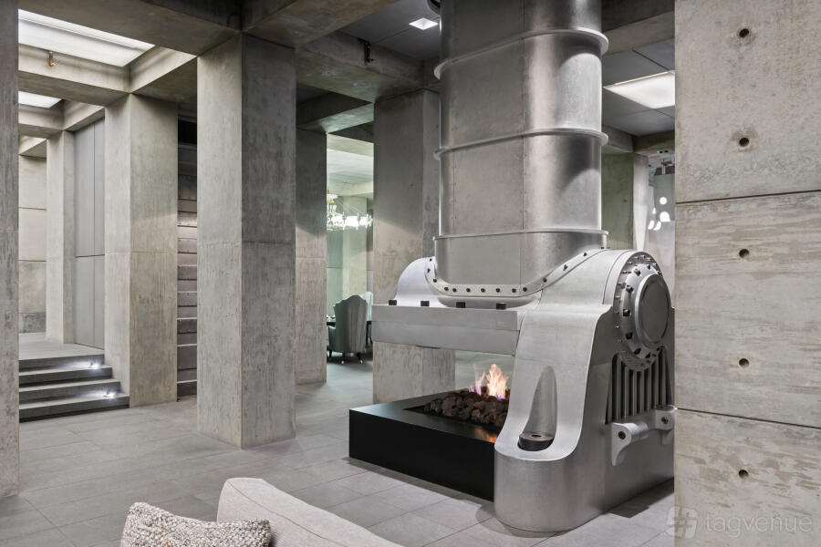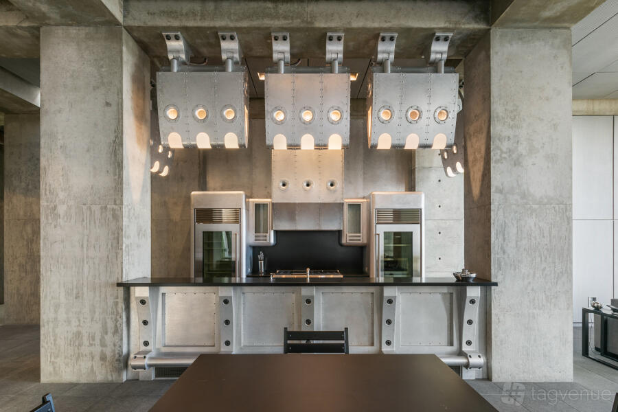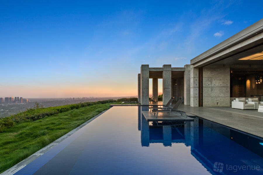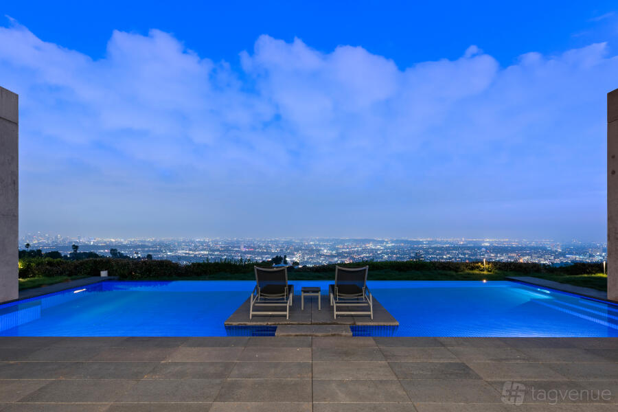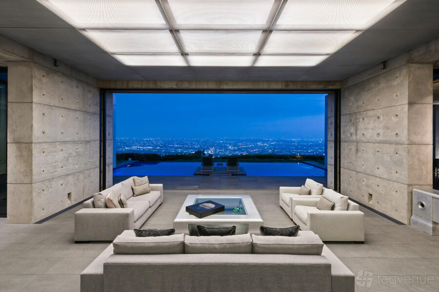 Enter through a dramatic, Stonehenge-inspired motor court into a stunning world of bold, industrial-chic design that evokes a cinematic James Bond allure. Sunlight floods expansive, open spaces, and the main room’s disappearing glass wall creates a seamless flow to the outdoors, leading to an all-tile infinity pool that appears to merge with the skyline—an extraordinary backdrop for any event or production.