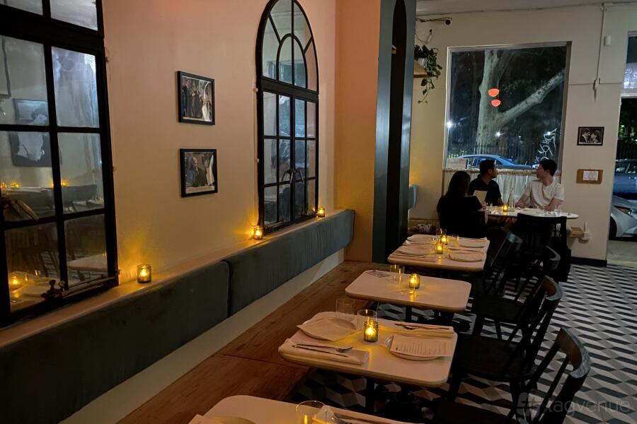 The bistro is divided into distinct zones: a bar area featuring a vast selection of wines displayed in elegant racks, a dining area with comfortable seating ideal for couples or small groups, and a private section for special occasions or group gatherings.