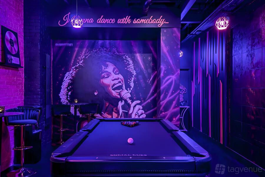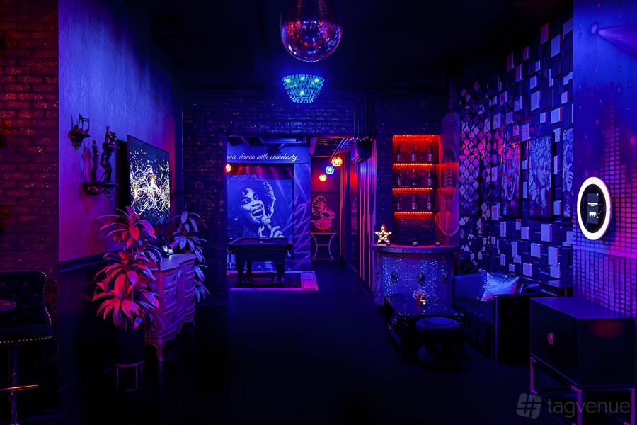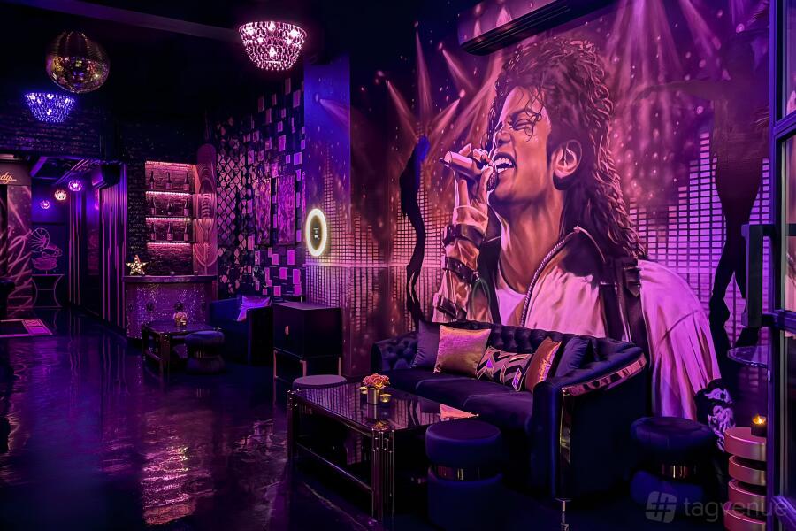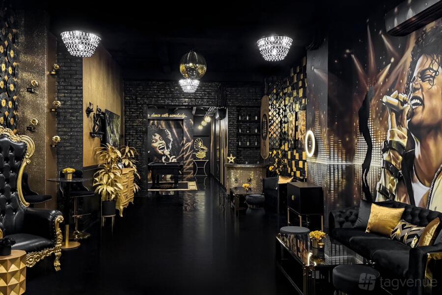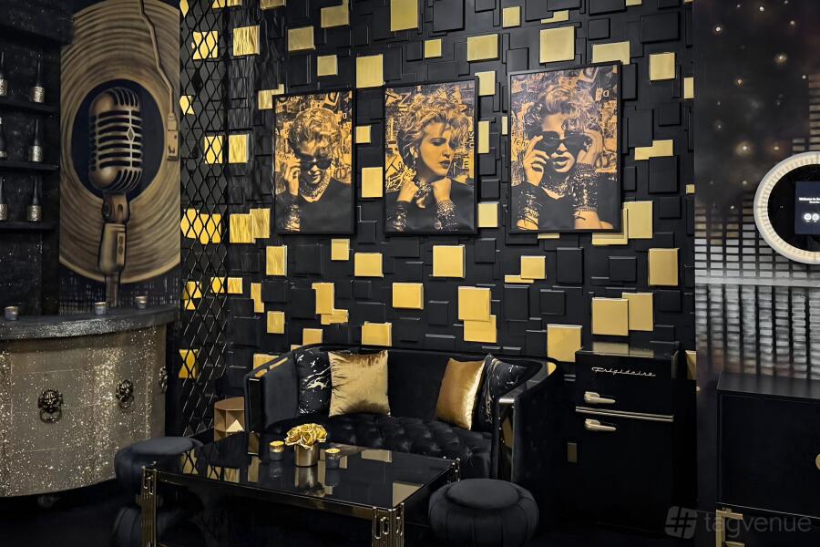 The space feels like a mix of a retro lounge and a backstage after-party. You’ll find big chandeliers, a sleek piano, a record wall, and a glittery gold arch that makes a great photo spot.