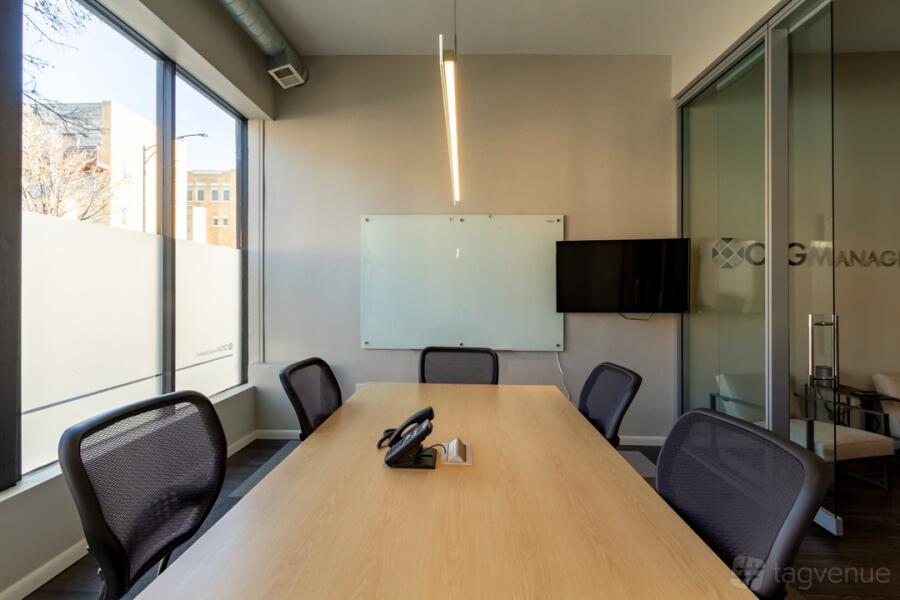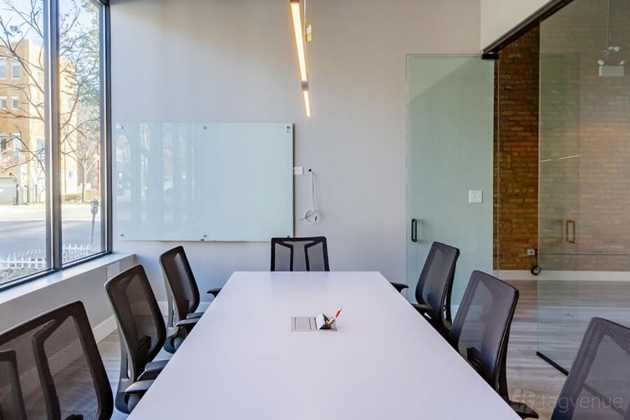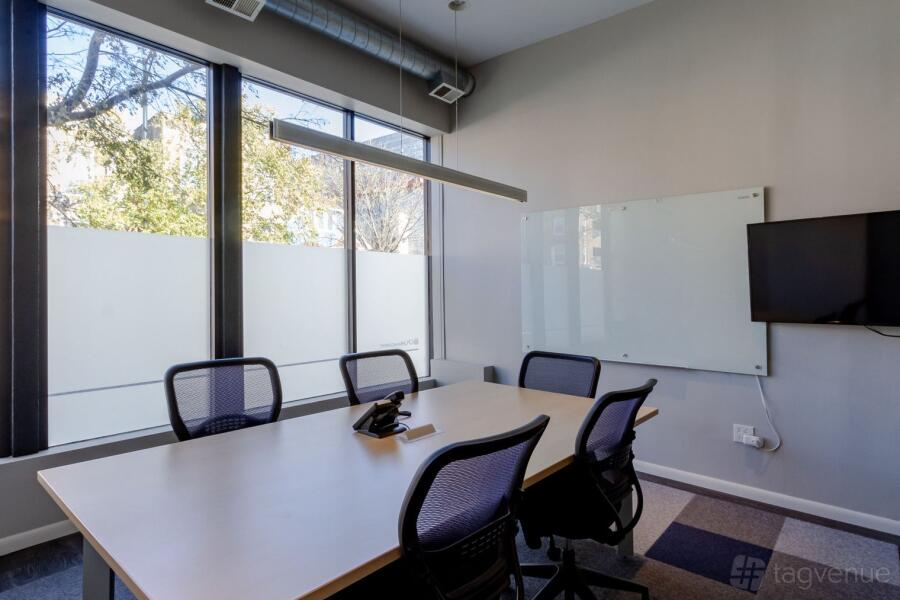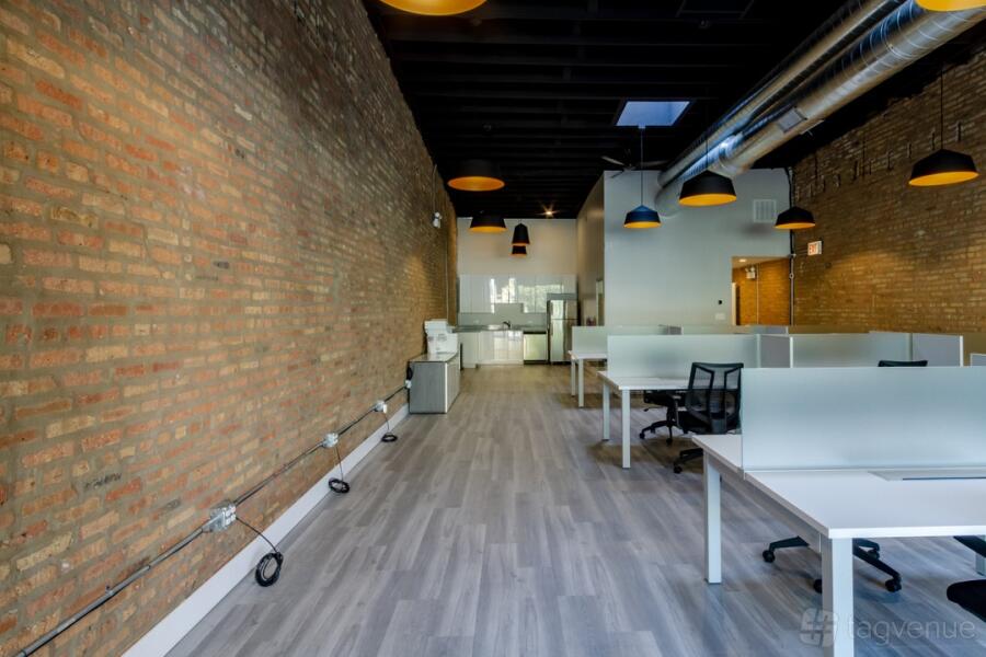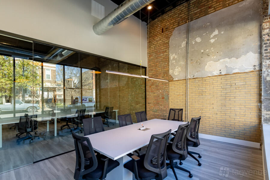 The space features an open industrial floor plan with 16’ ceilings and skylights throughout providing working light all day. Two large conference rooms are available to reserve for that all-important meeting or breakout working session. A kitchenette and lounge area round out the space.