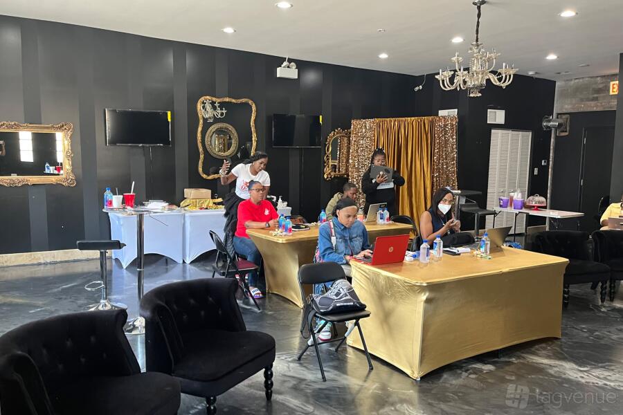 It has a modern, and aesthetically pleasing interior with facilities for both casual gatherings and formal events. Venue includes tables, chairs, and a prominent Bluetooth party speaker to highlight the amenities offered if needed by renter.