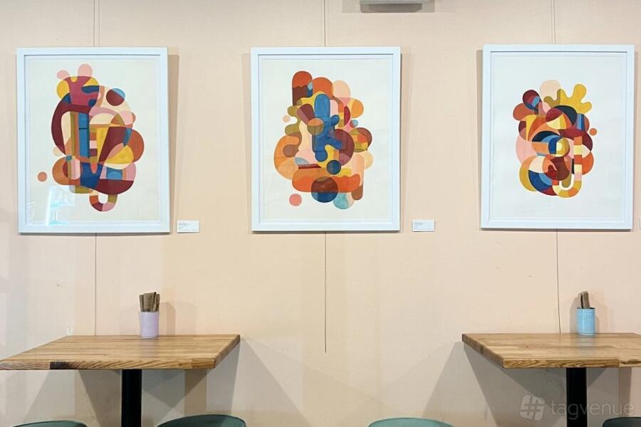 Inside, Logan Vegan Cafe has a modern, minimalist interior with an eco-friendly edge. It features high-top tables, stools, a countertop fridge, and a freezer, ideal for weddings, birthdays, corporate events, and private parties. The cafe also features local artwork.