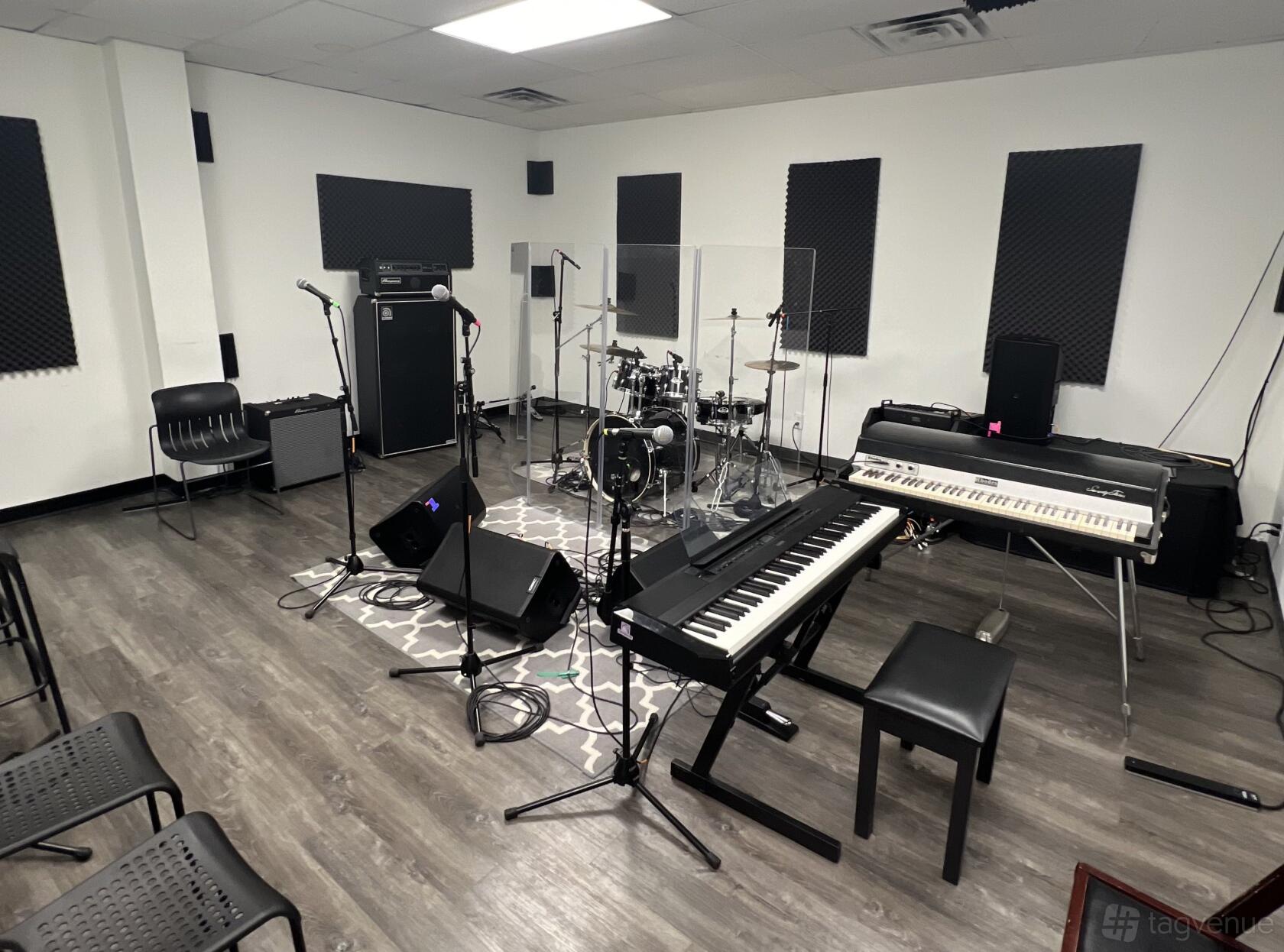 Our Rehearsal Rooms are perfect for medium to large size band or choir practice. Upon request, our rooms may include a 5-piece drum kit, monitors, 88-key digital piano, Zoom L20 16-channel digital mixer, Galaxy Audio in-ear system (earbuds not included), subwoofer, guitar and bass amps, vocal mics (with stands and cables) and drum mics for recording.