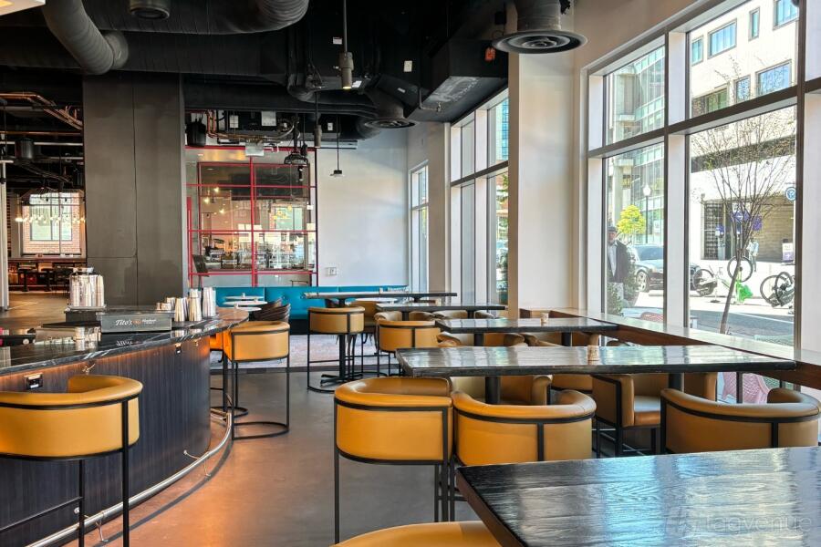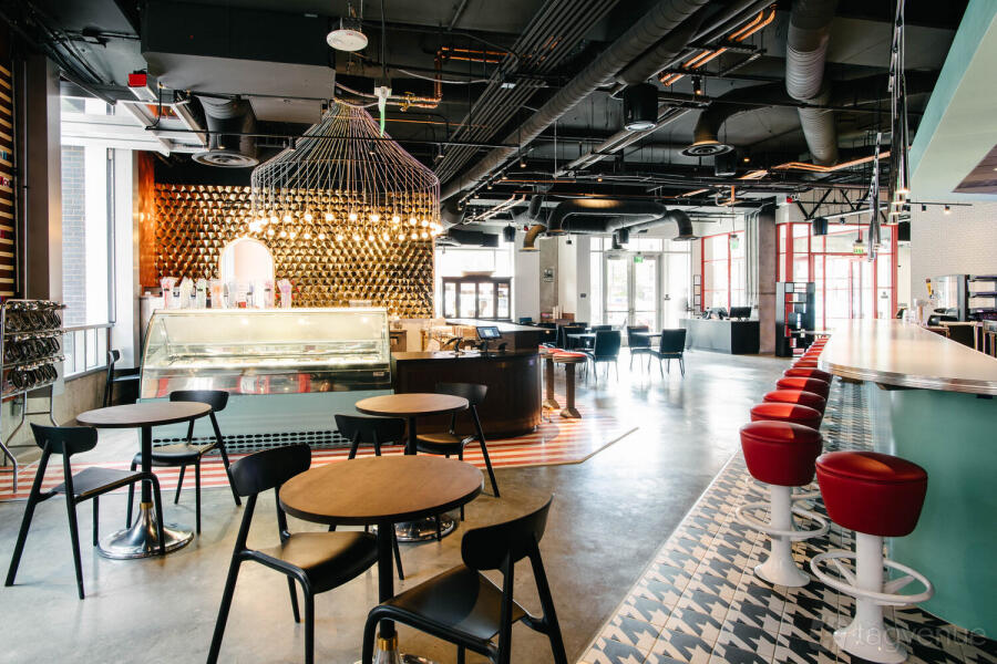 The Denver Milk Market is an elevated food hall with 12 different food and beverage stalls serving various types of food and drinks with community seating all around.