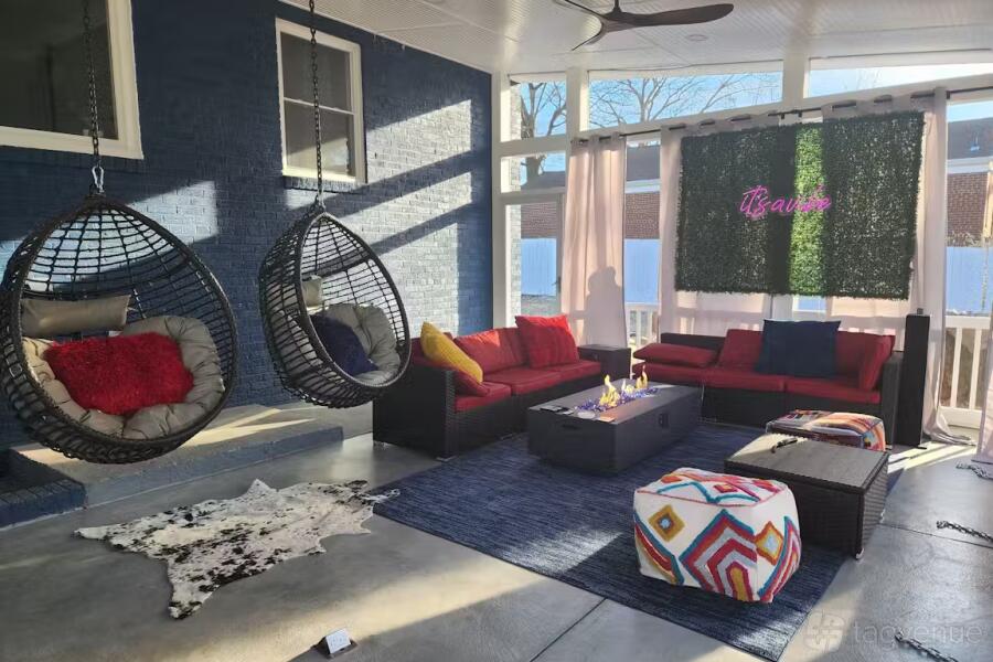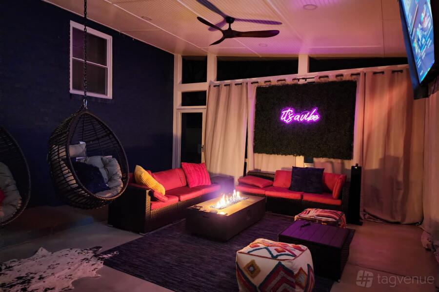 The venue is family and pet-friendly, offering a playground equipped with slides, swings, and a seesaw on a safety-focused platform. The expansive half-acre gated and fenced backyard provides ample room for children and pets to enjoy. Driveway and street parking are available, making access convenient for all guests.
