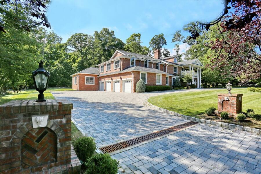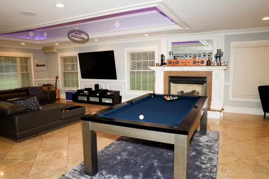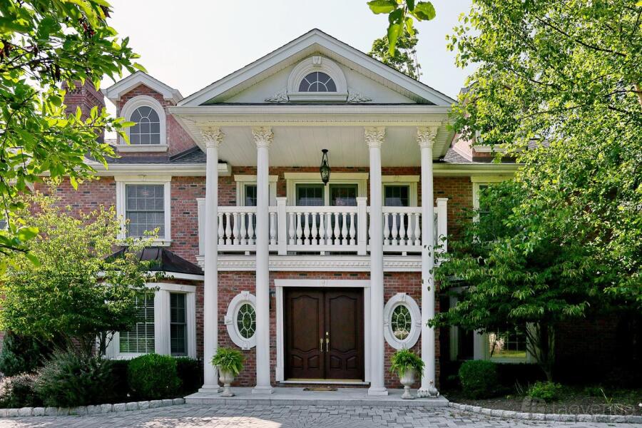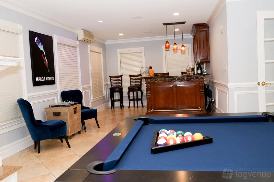 The home has a circular driveway and features marble floors, a dining room, den with a bar and pool table, piano room, kitchen with a breakfast nook, and an indoor pool with a hot tub. Multiple entrances lead to the backyard, offering flexibility for any occasion.