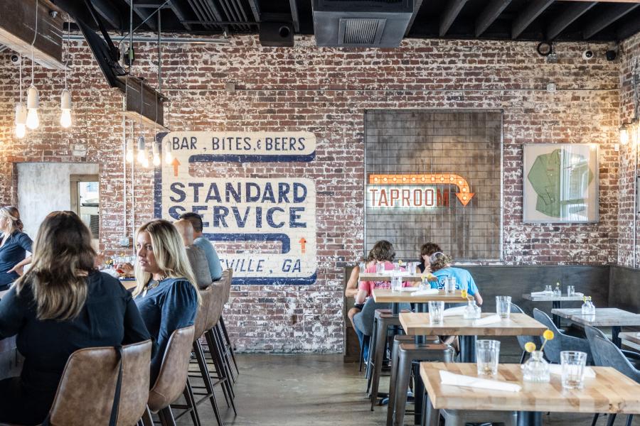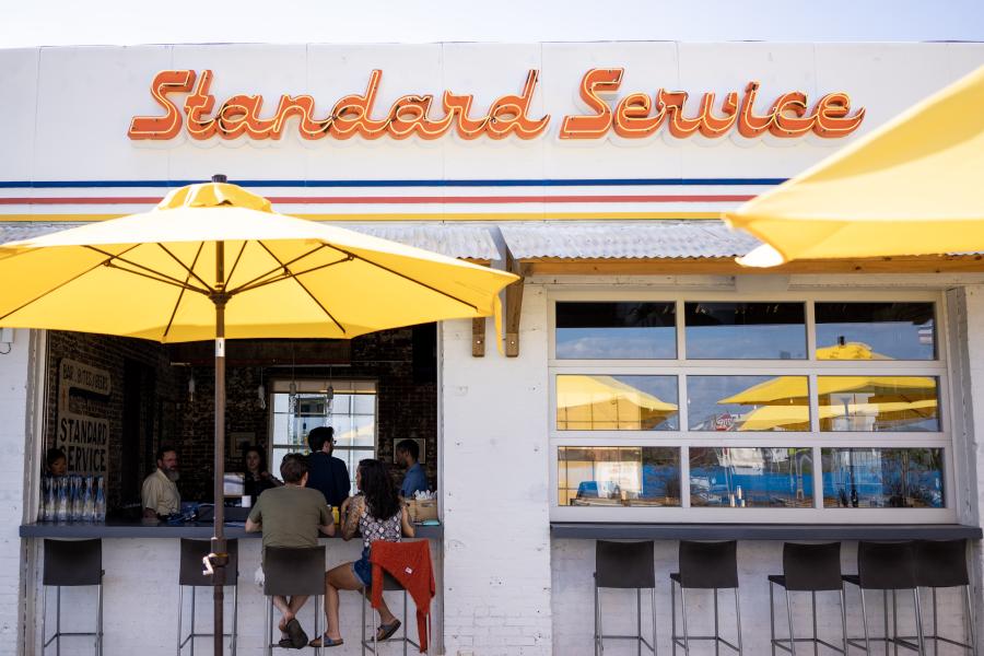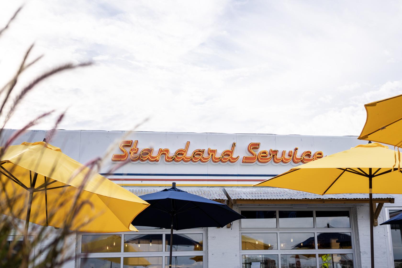 Serving neighbourhood pub dishes made with good ingredients, Standard Service focuses on approachable offerings and twists on classics, with something for everyone. The menu includes snacks and apps to share, salads, sandwiches, entrées, and sides. Standouts include New Orleans BBQ Shrimp – spicy blackened shrimp with seasoned beer butter & garlic crostini, Steak Frites – grilled & sliced Kansas City strip, fries, caramel shallot & dijon cream sauce, Seared Citrus Salmon with corn & butter bean succotash & lime butter sauce, and Pimento Mac & Cheese. The beverage menu features 40 local beers and 10 approachable wines in a self-serve taproom, plus wine by the glass, draft pints and a full bar offering a variety of fun, playful cocktails in the dining room.
