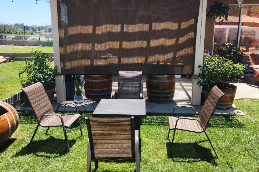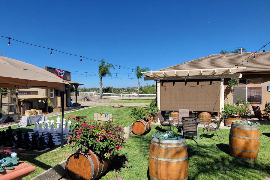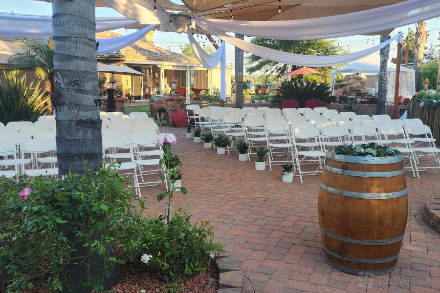 Saying "I Do" beneath a canopy of grapevines, bathed in the warm glow of the setting sun. Our expansive Main Patio, with its smooth concrete surface, transforms seamlessly into an elegant reception space or a lively dance floor.