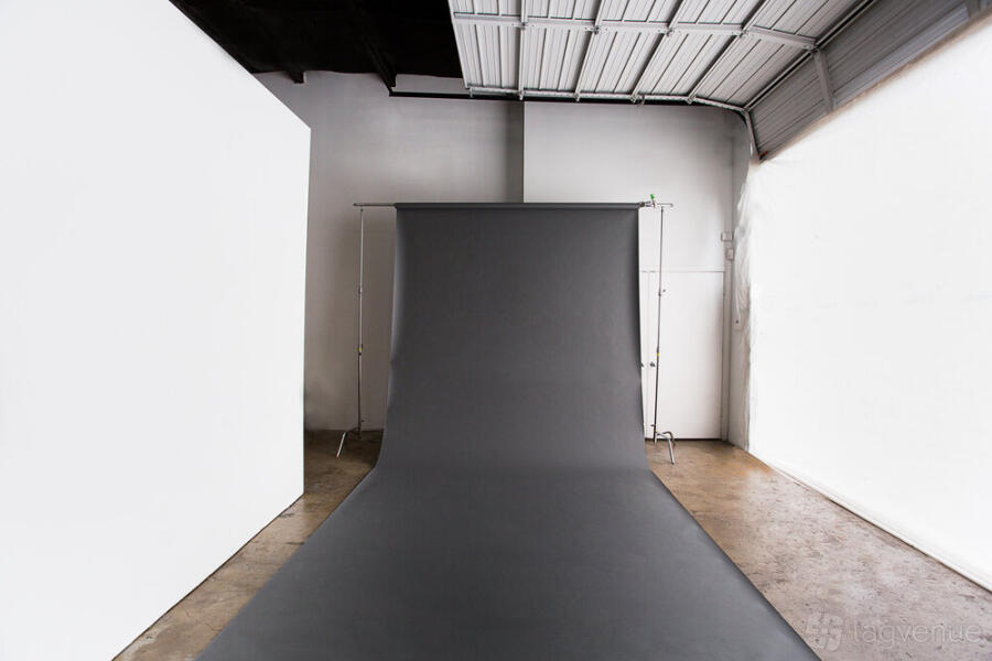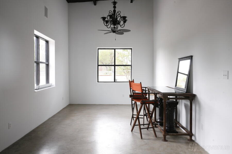 Select Studios offers a 12 ft x 12 ft bay door and a 16 ft ceiling, as well as a makeup room, dressing room, kitchen, and reception gallery. Total space is 2400 sq ft.