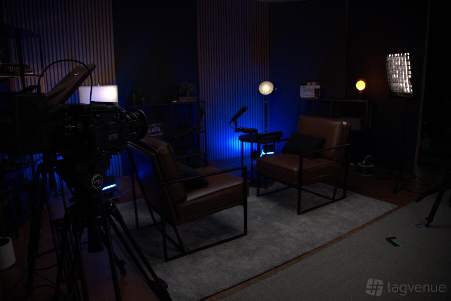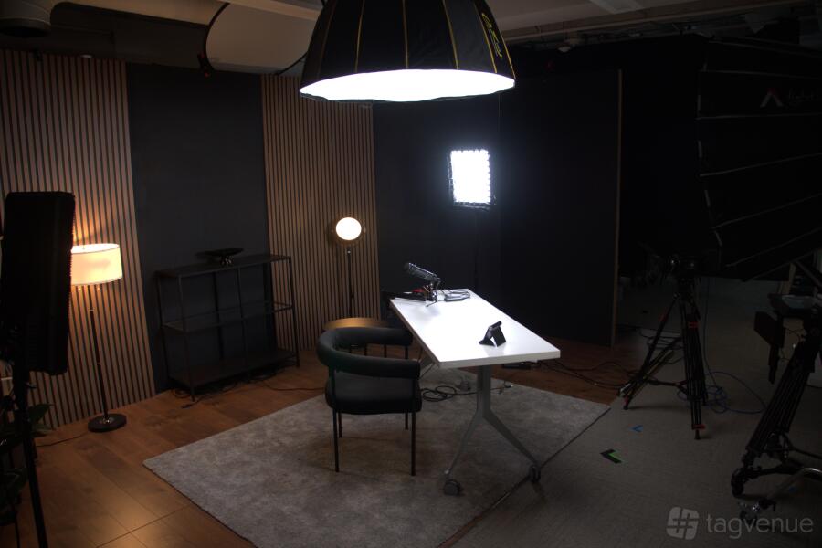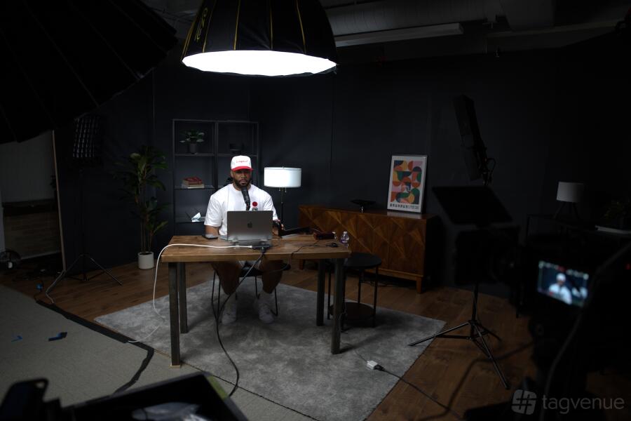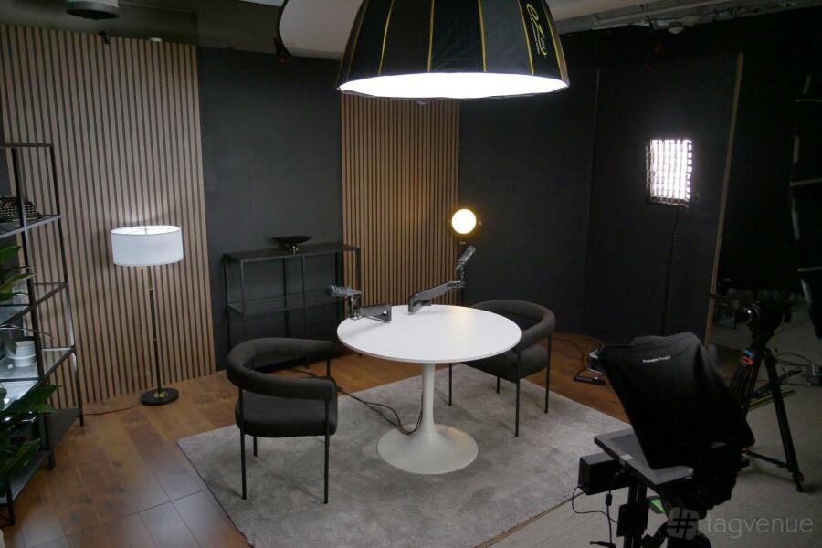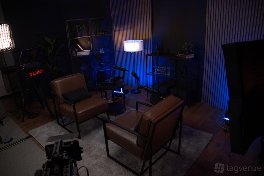The studio features a modern, flexible layout with a professionally sound-treated main recording room. We offer two distinct sets: a main table for up to four guests with professional microphones and a comfortable lounge area for a more relaxed vibe. An experienced audio and video engineer is included to manage all technical aspects of your session.