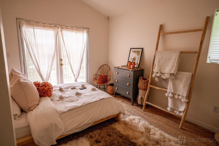 The main house features two bedrooms with an open layout connecting the kitchen, living room, and dining area. It's perfect for relaxing. There's also a cozy one-bedroom cottage on the property, complete with a king-size bed, a spacious living room, a bathroom, and a private deck with a hot tub, outdoor sink, and BBQ.