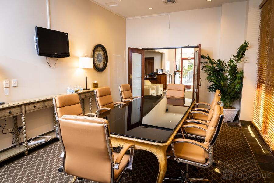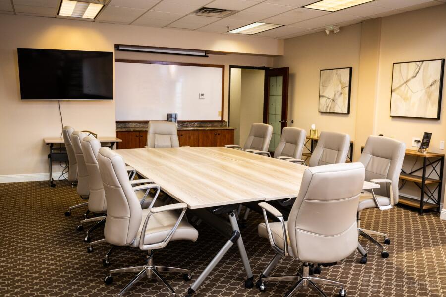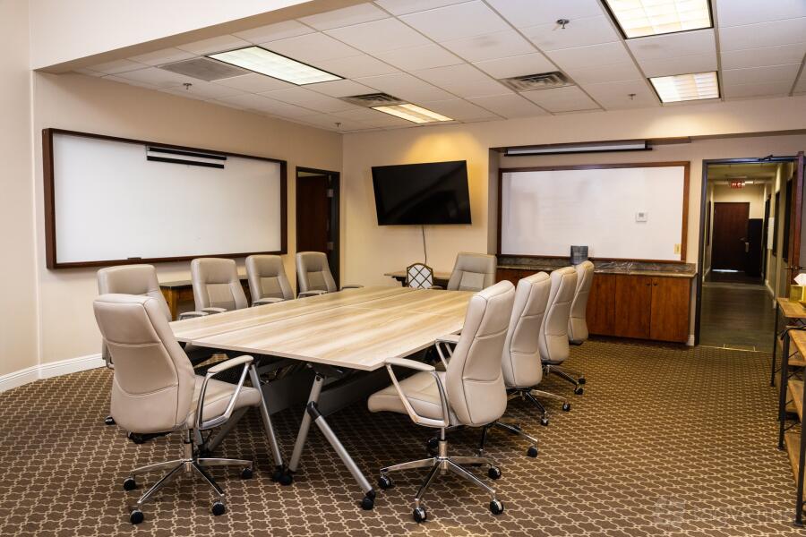 The training room provides a well-appointed setting for up to 25 participants. The room features a large table and comfortable chairs. It is equipped with a flat screen TV and a whiteboard. This versatile room can accommodate a variety of needs, from workshops and seminars to team meetings and training sessions.