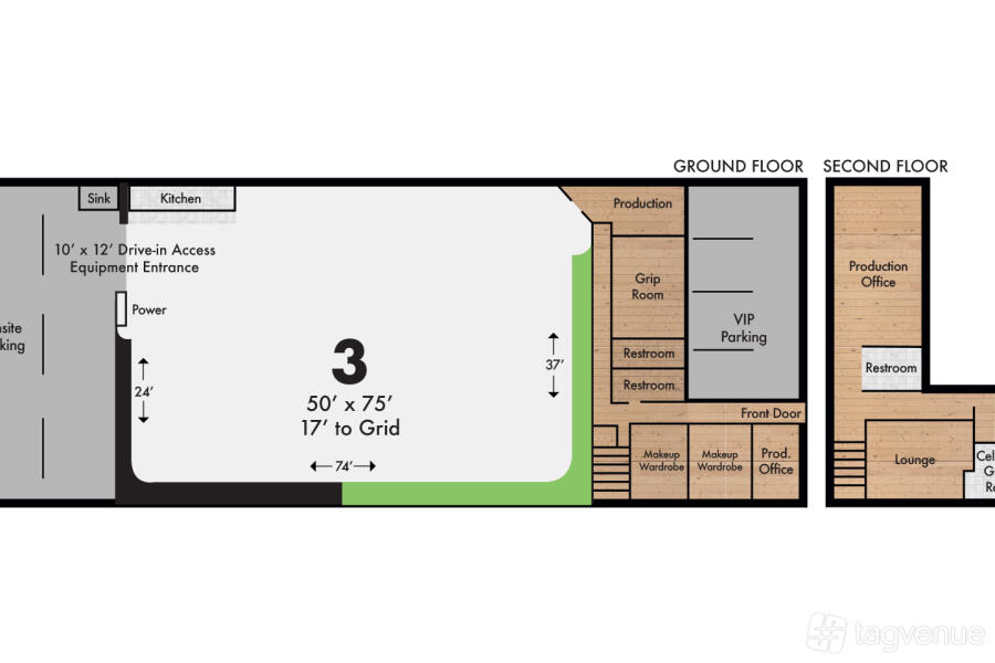 Included with each sound stage rental are fully equipped production offices, private green-rooms, multiple make-up and wardrobe rooms, lounges, power, silent A/C, basic grip package, fiber-optic 250 up/down internet, kitchens, dumpsters and private VIP drive-on capability with secure parking. Lighting and additional grip packages also available.