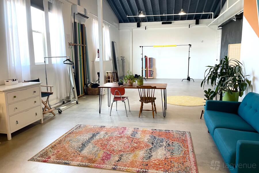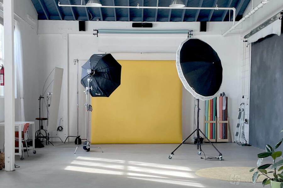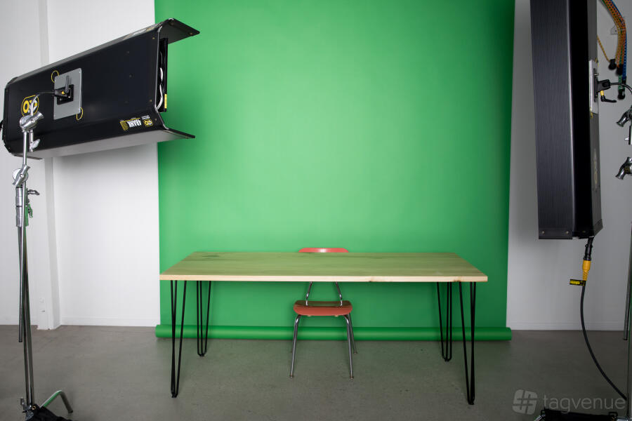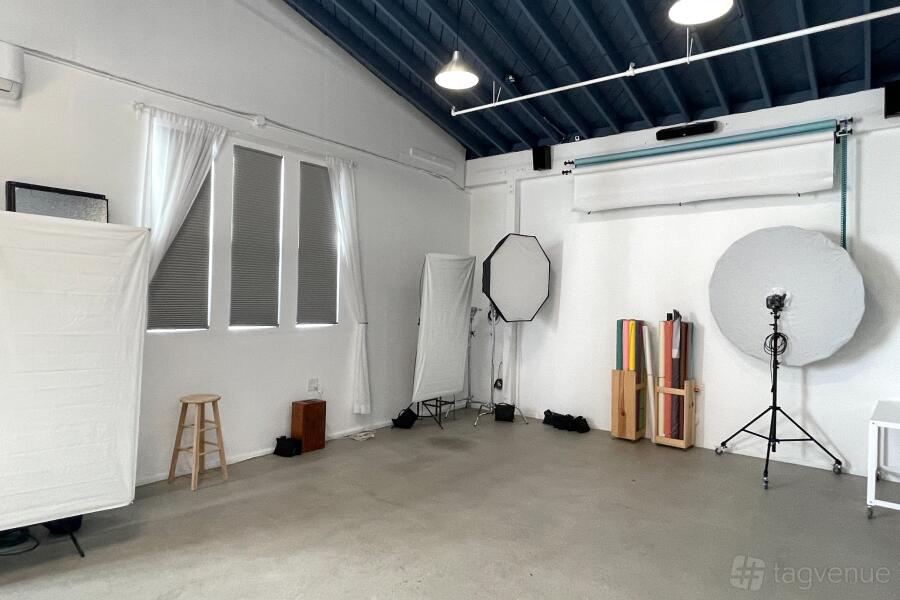 The main photo studio, meeting/workspace, and bathroom. The studio includes all furniture, lights and equipment listed/pictured. Also included: large plain white wall, a gritty gray textured wall, a color burst mural wall, and vanity area. This section also features a quiet split unit air conditioner with remote control access.