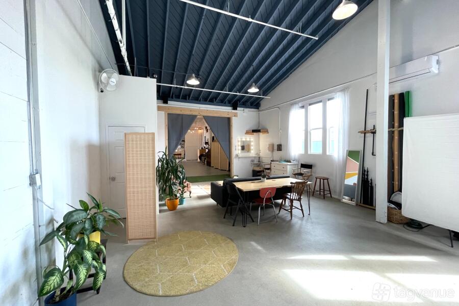 Entryway, Loading Area. Lots of natural light for photo shoots and great for lounging, staging, or airy break area. If you opt to shoot any video in this front room during a weekday, know that you may have to contend with noise from neighboring businesses.