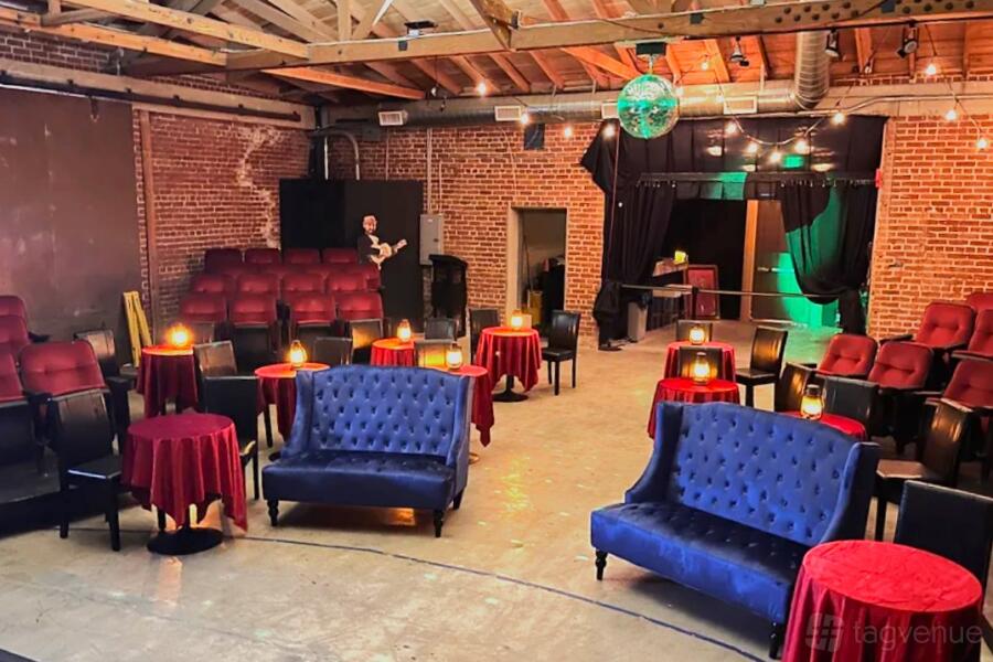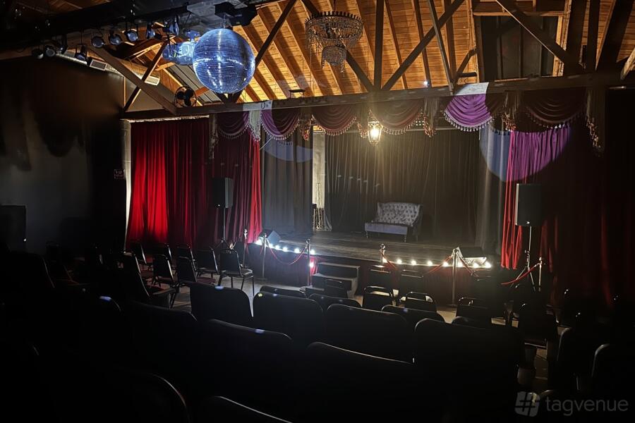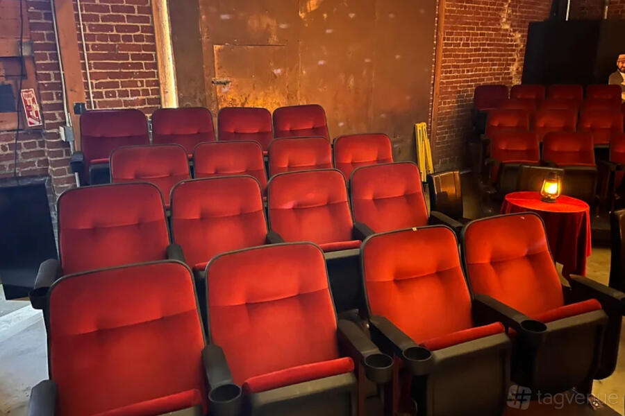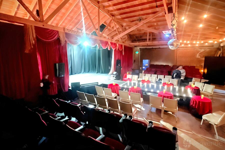 The space includes a backstage greenroom with a vanity and couch for performers, as well as a lobby bar and concession area for guest refreshments. This setup is perfect for performances, screenings, and other events.