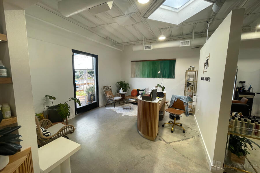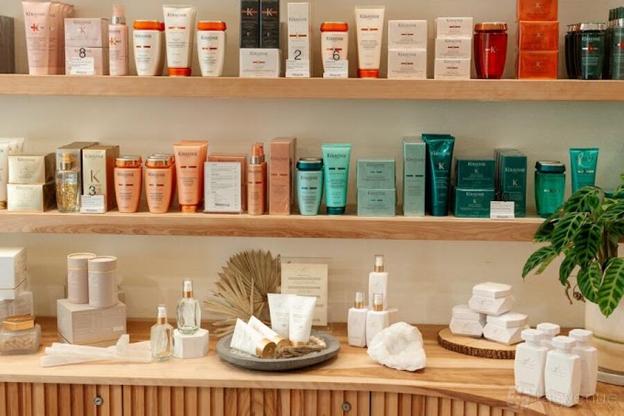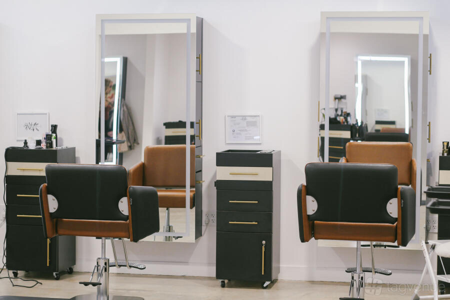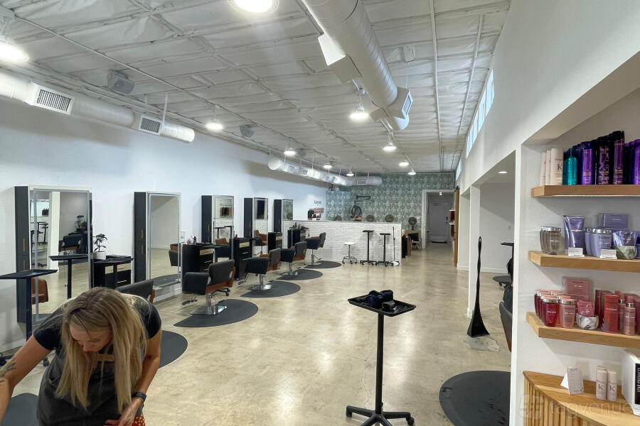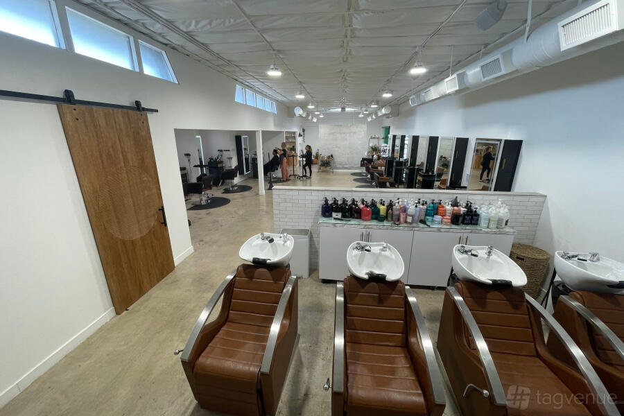 The salon boasts a trendy and modern atmosphere with high ceilings, giving the space an open and spacious feel.