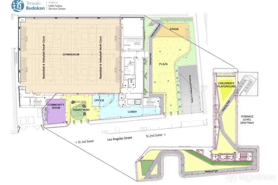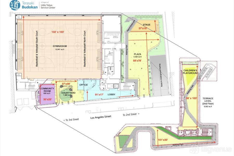 Our facility boasts five main rental spaces along with an underground parking lot. The Plaza & Stage is ideal for weddings, concerts, and various events, beautifully adorned with bistro lighting and surrounded by lush vegetation, trees, and shrubs. The outdoor Terrace provides stunning views of Los Angeles Street and the Plaza & Stage below, featuring green spaces, a children's playground, a community garden, and a mural. The Community Room is perfect for classes, meetings, and more, including a built-in TV and floor-to-ceiling glass windows offering courtyard views. The Courtyard, with its trees and rock garden, offers an indoor-outdoor ambiance ideal for meetings, classes, ceremonies, and meditation. The Gymnasium is versatile for both sports and non-sports uses, featuring two basketball courts, four volleyball courts, and a competition space for martial arts with seating for up to 600 spectators. For non-sports events, the gym can be transformed with a floor covering system (additional fee required) and includes a sound system.