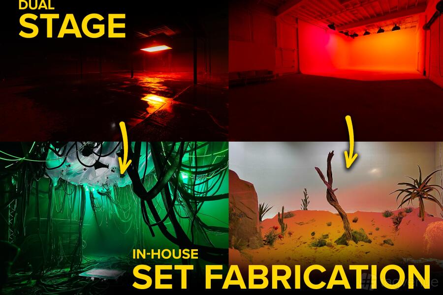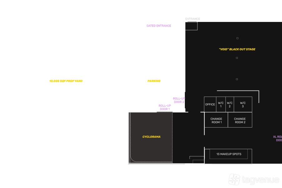Convenience is a hallmark of Moonlight Studios, with drive-in roll-up doors allowing easy loading and unloading of equipment and set pieces directly into the studio. The facility also boasts comfortable amenities such as fully equipped makeup rooms and lounges for the cast and crew to relax between takes. Extensive equipment support is available, including a secure lighting cage for all your technical needs, ensuring your production runs smoothly.