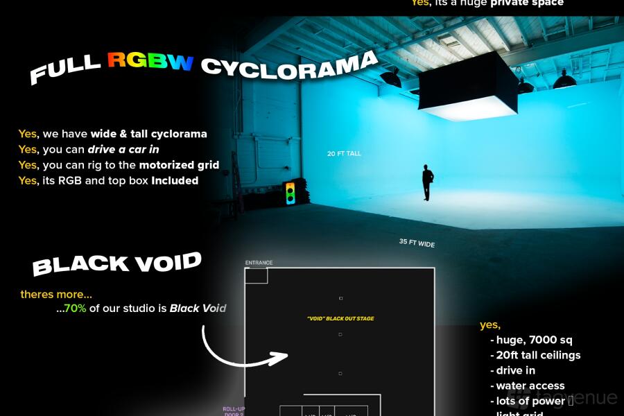Moonlight Studio + Rentals LA, located at 3521 W Washington Blvd, Los Angeles, CA 90018, is an exceptional facility designed to accommodate and enhance your productions and events. The studio features two distinct stages: a blackout "VOID" stage, perfect for complete light control and versatile shooting options with water access, and a cyclorama pre-lit with RGB lighting, offering dynamic and customizable backdrops to suit any creative vision.